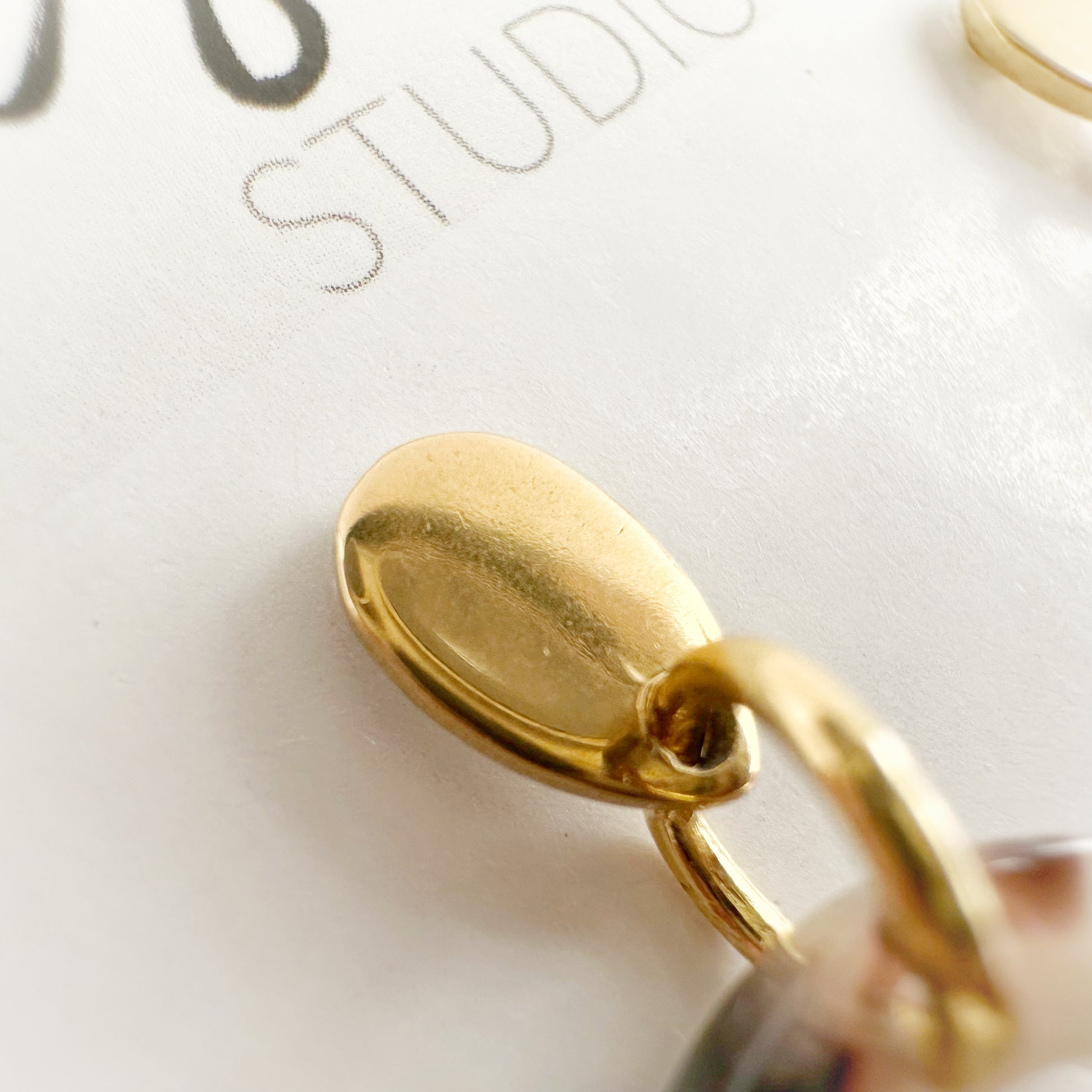 MATERIALS: cellulose acetate, gold-plated stainless steel bases, posts, and jump rings