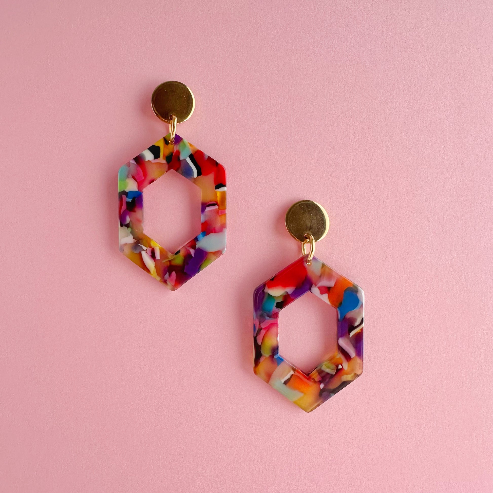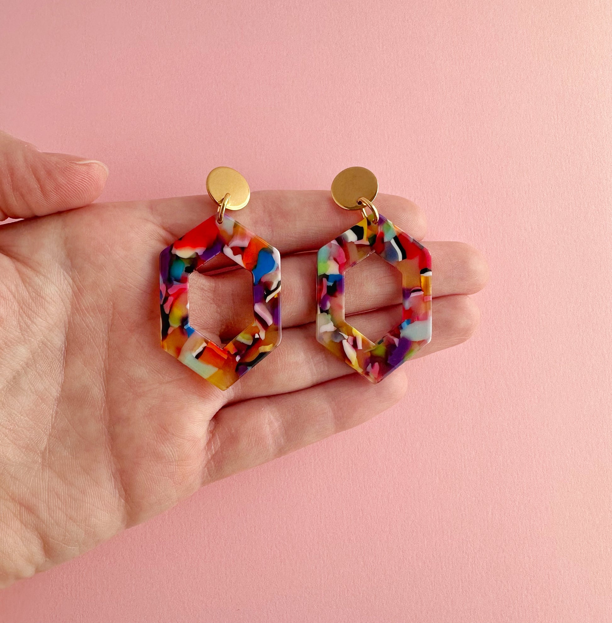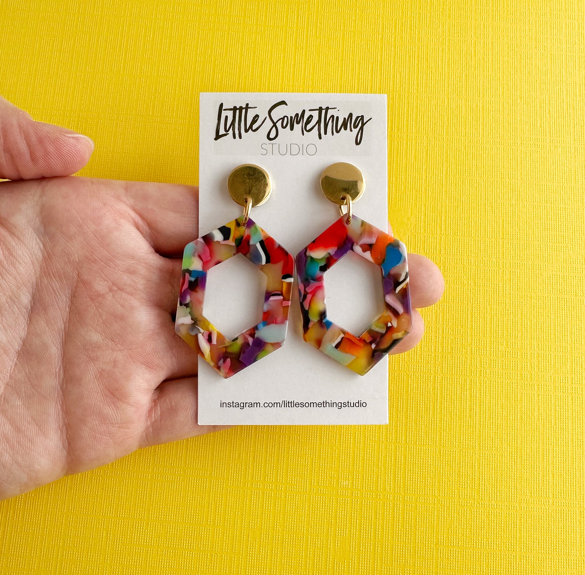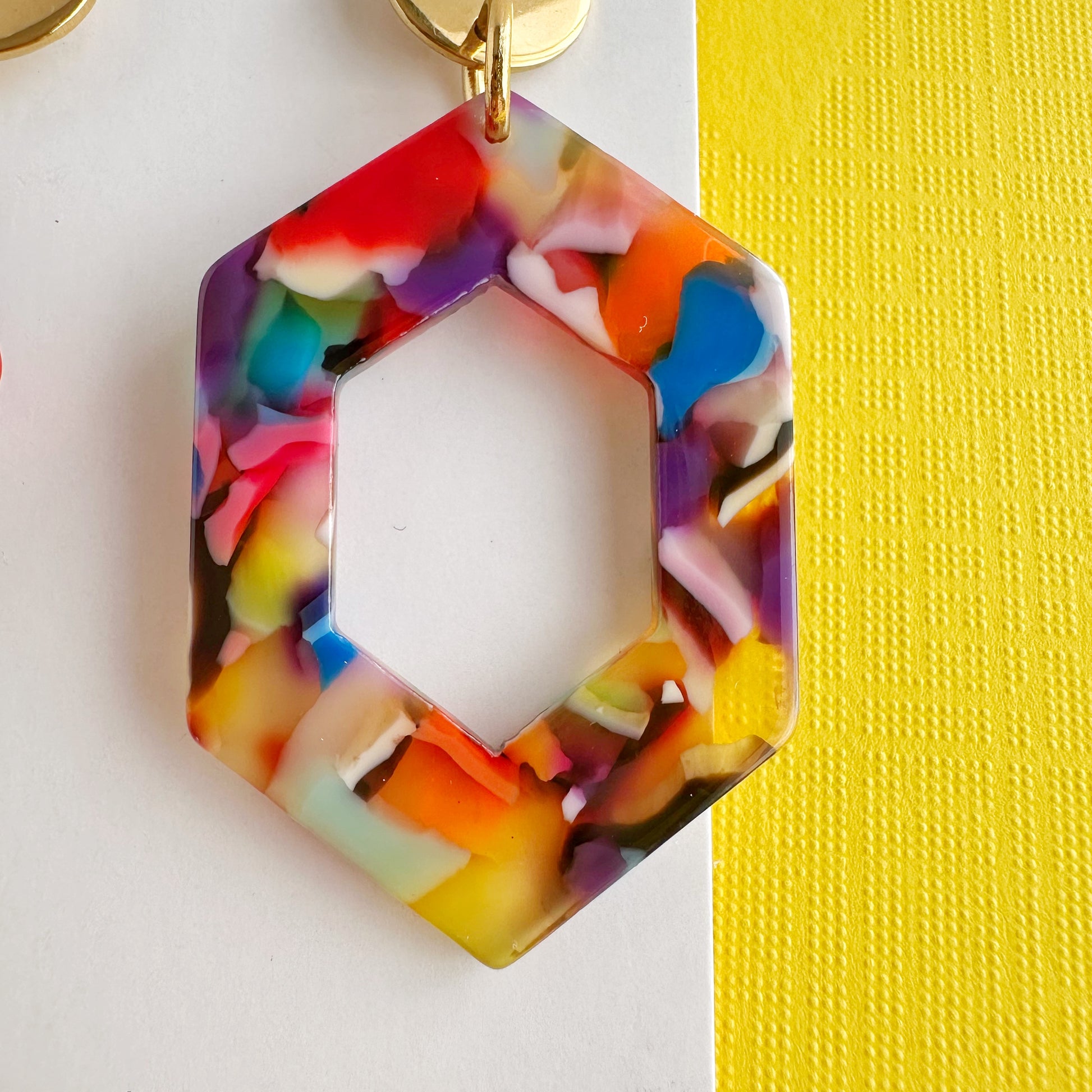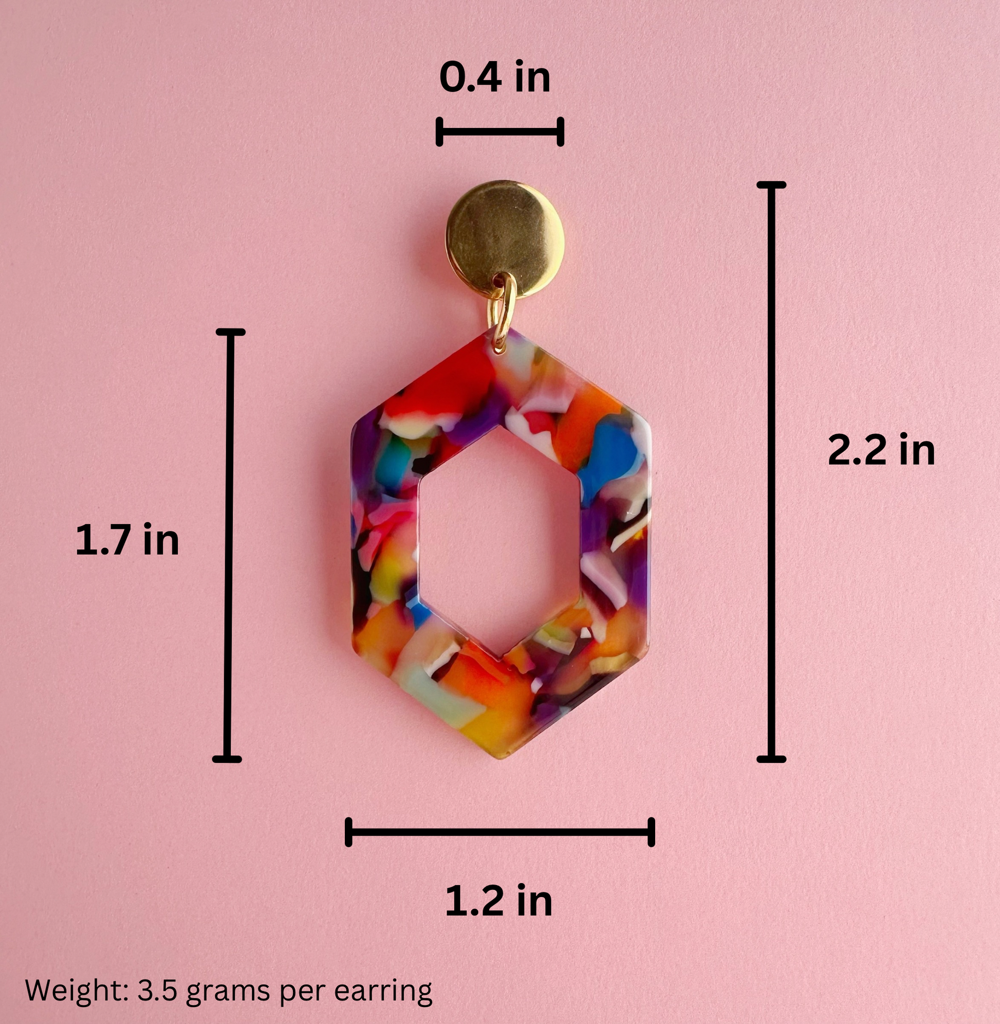 Make a bold statement with these colorful hexagon acetate earrings! Featuring a vibrant multicolor design and modern geometric shape, these lightweight dangle earrings add a playful yet artistic flair to any outfit. The bold color mix and faceted hexagon silhouette create a standout accessory perfect for anyone who loves expressive, handmade statement jewelry. Whether you’re dressing up or keeping it casual, these earrings will instantly elevate your look.