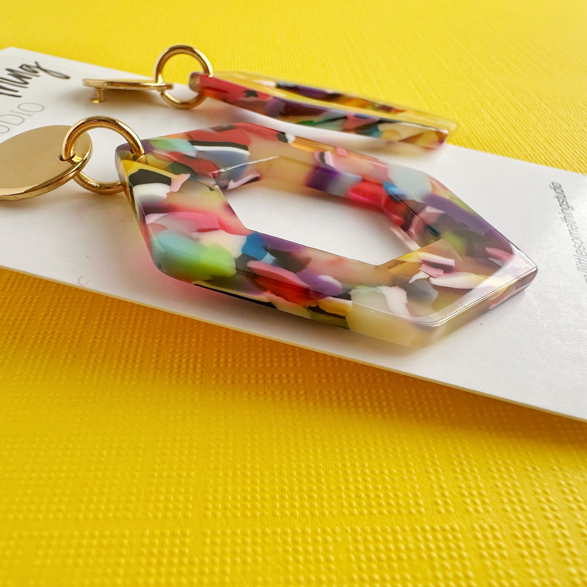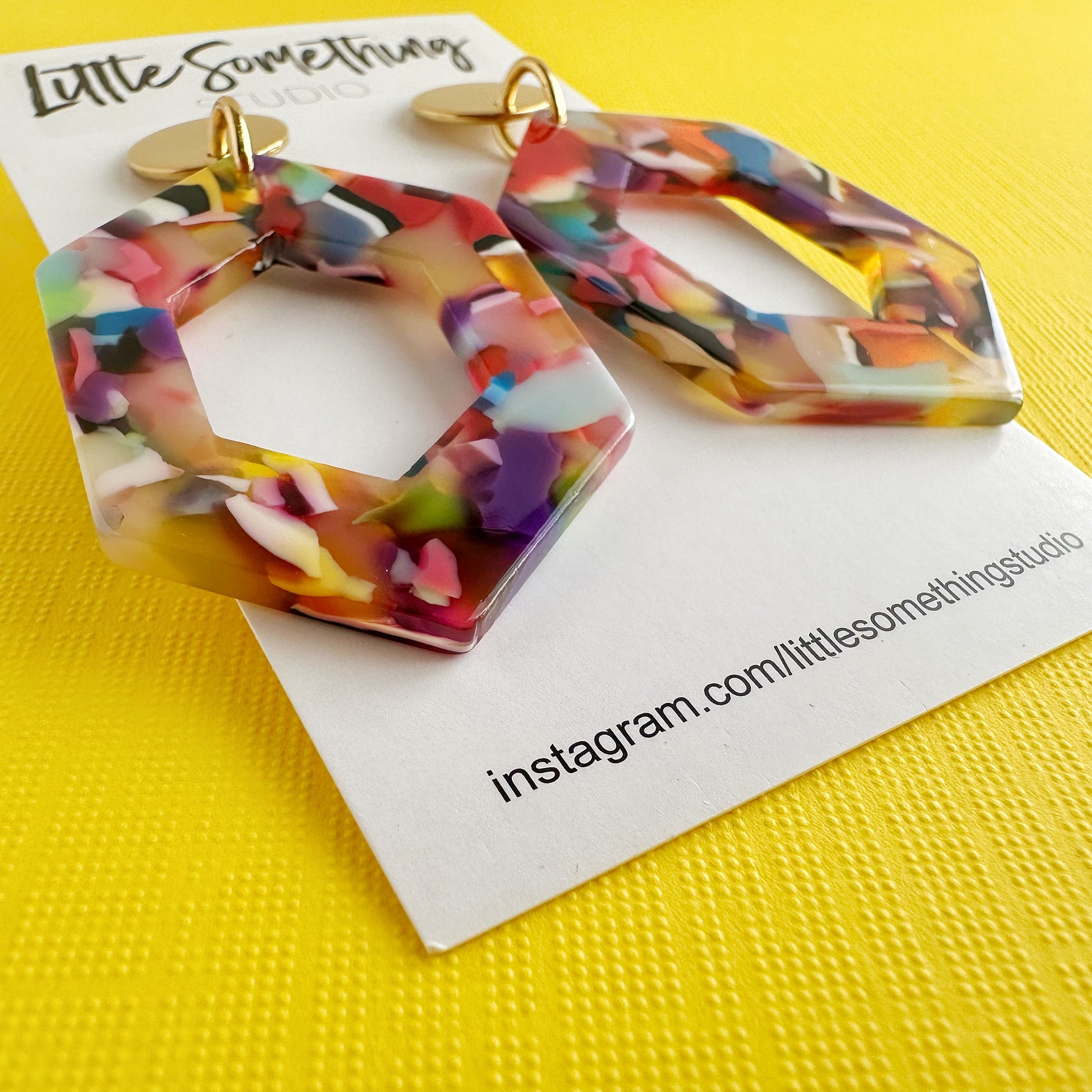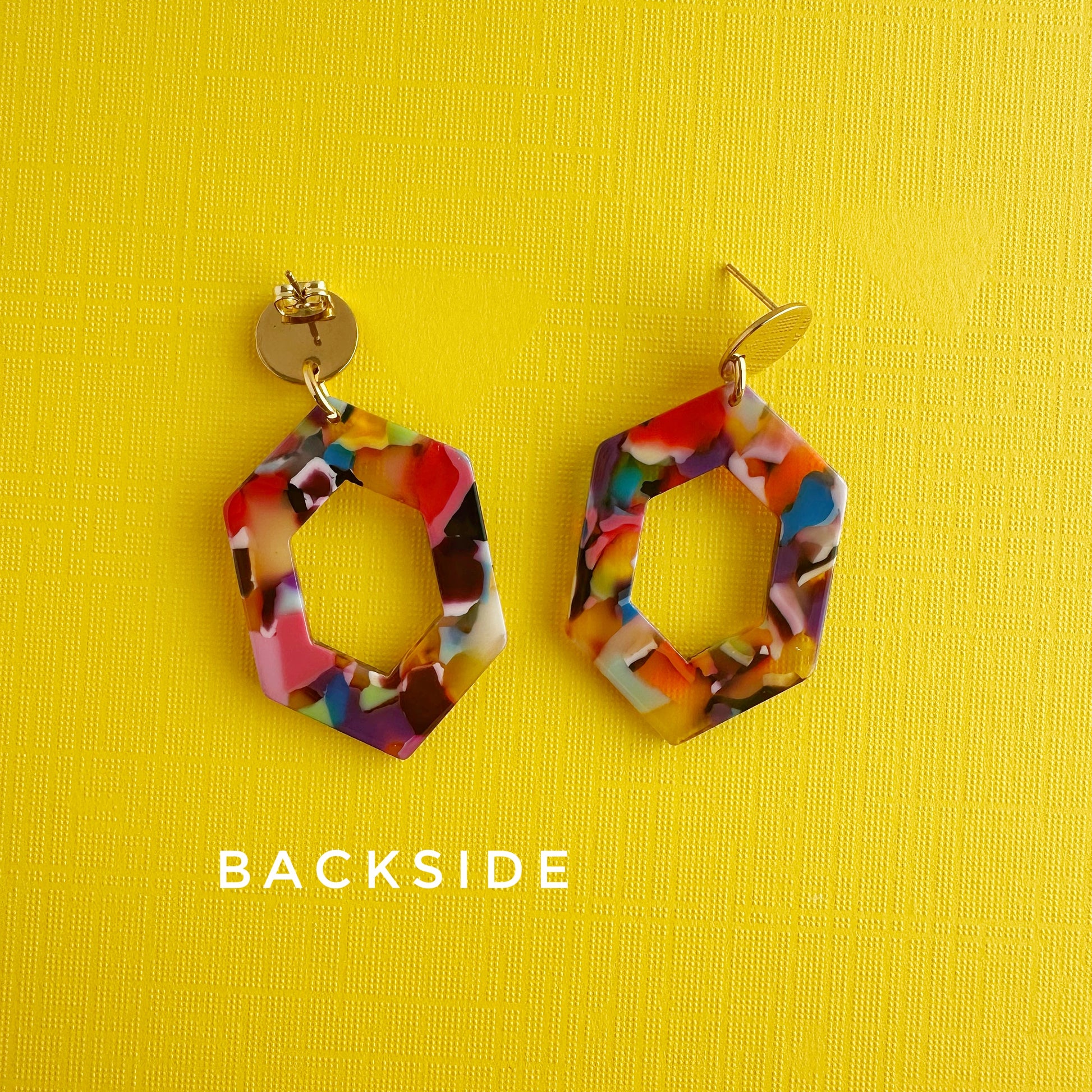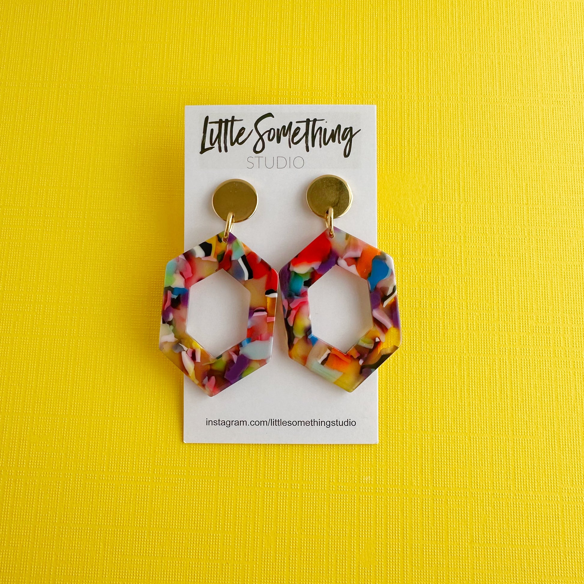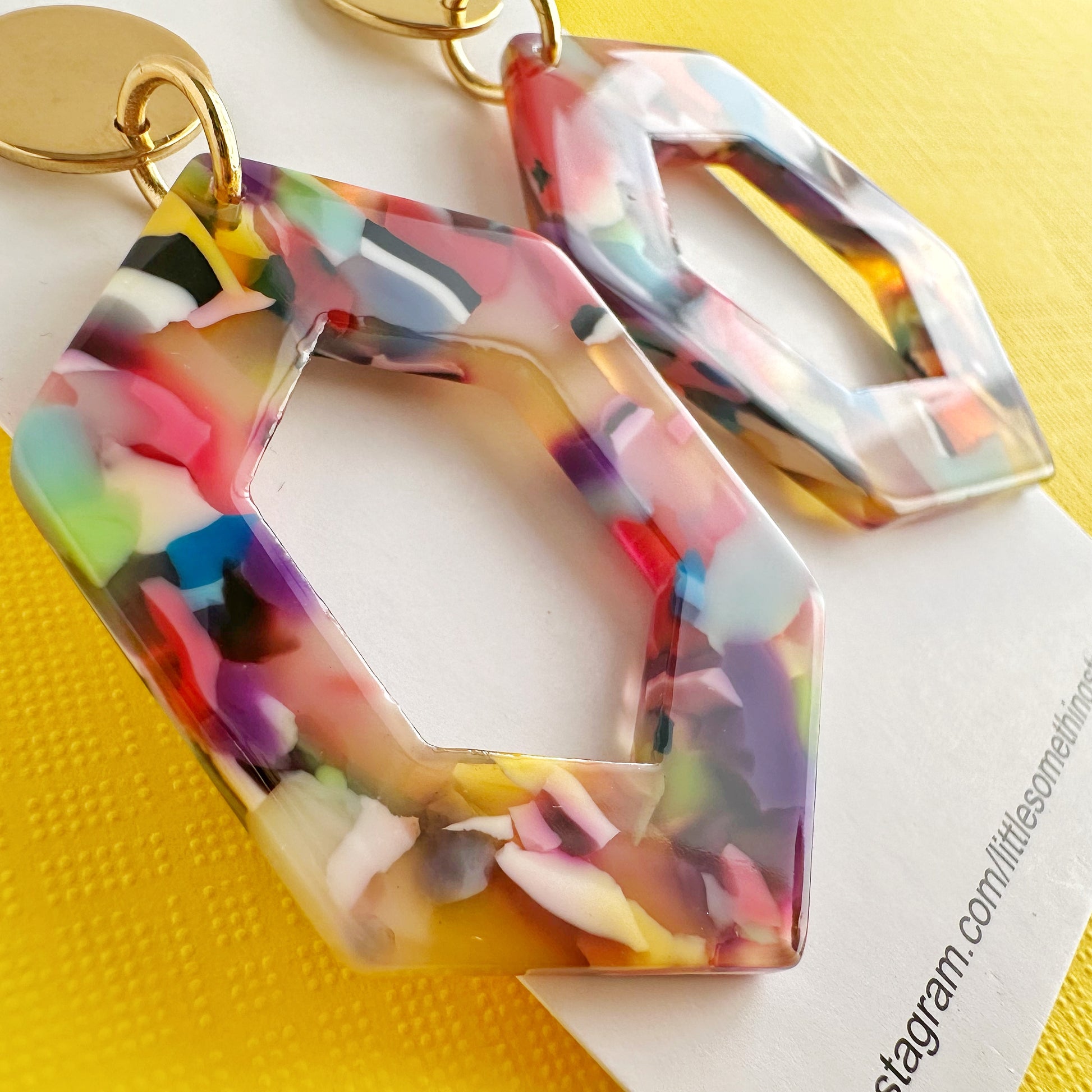 Make a bold statement with these colorful hexagon acetate earrings! Featuring a vibrant multicolor design and modern geometric shape, these lightweight dangle earrings add a playful yet artistic flair to any outfit. The bold color mix and faceted hexagon silhouette create a standout accessory perfect for anyone who loves expressive, handmade statement jewelry. Whether you’re dressing up or keeping it casual, these earrings will instantly elevate your look.