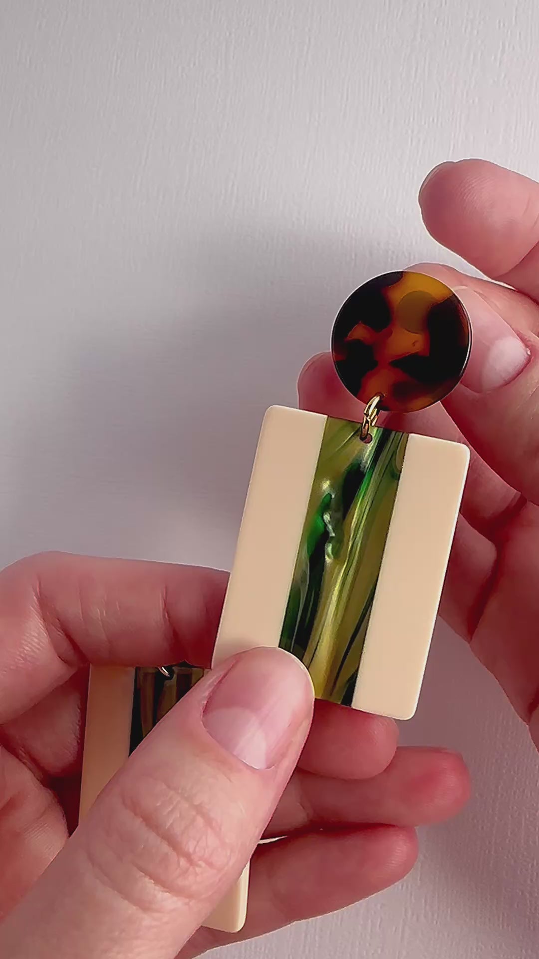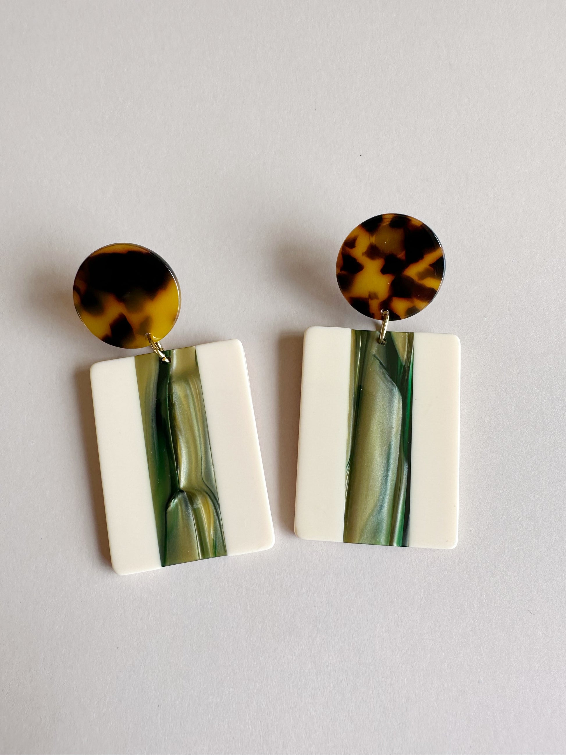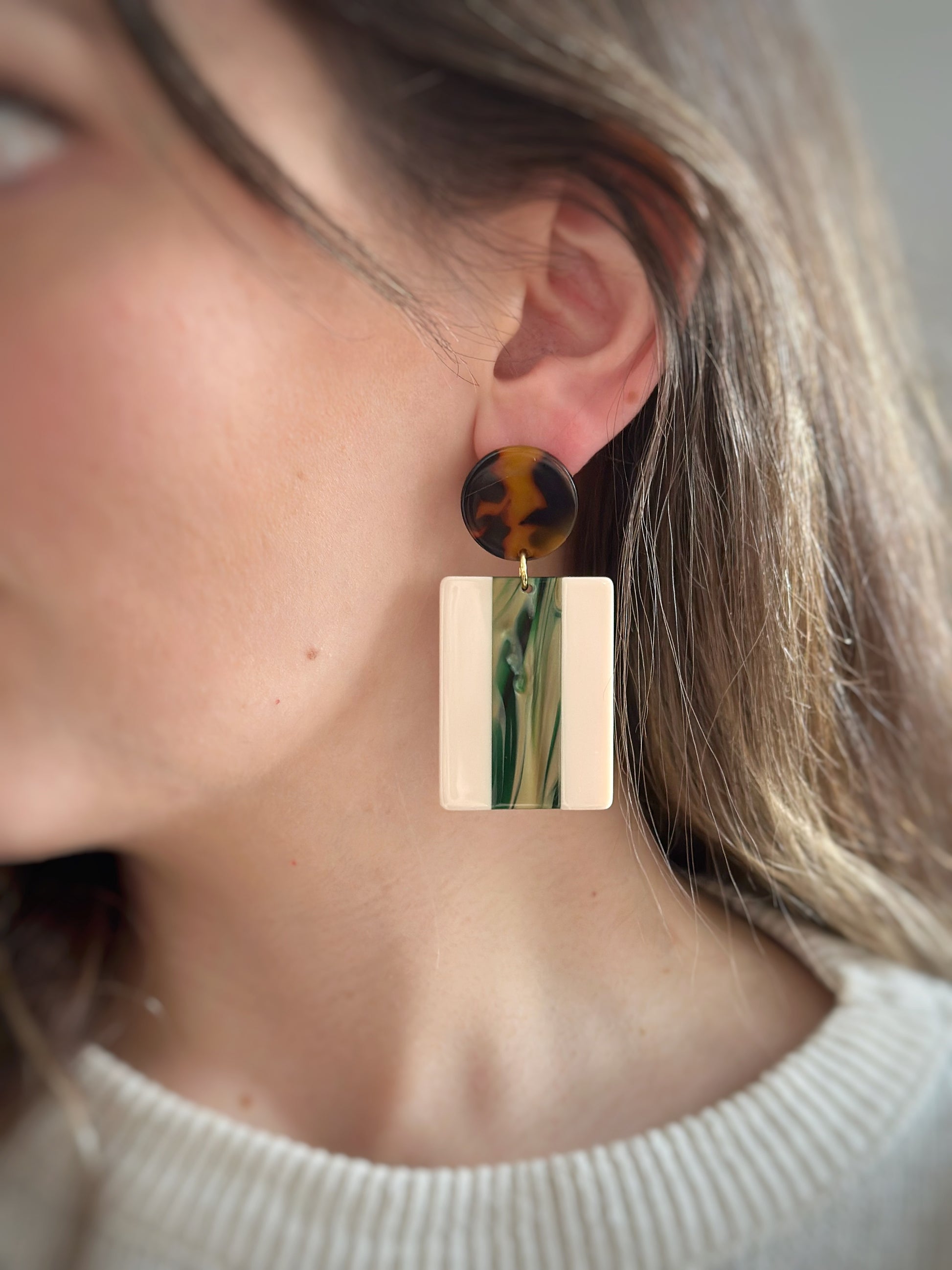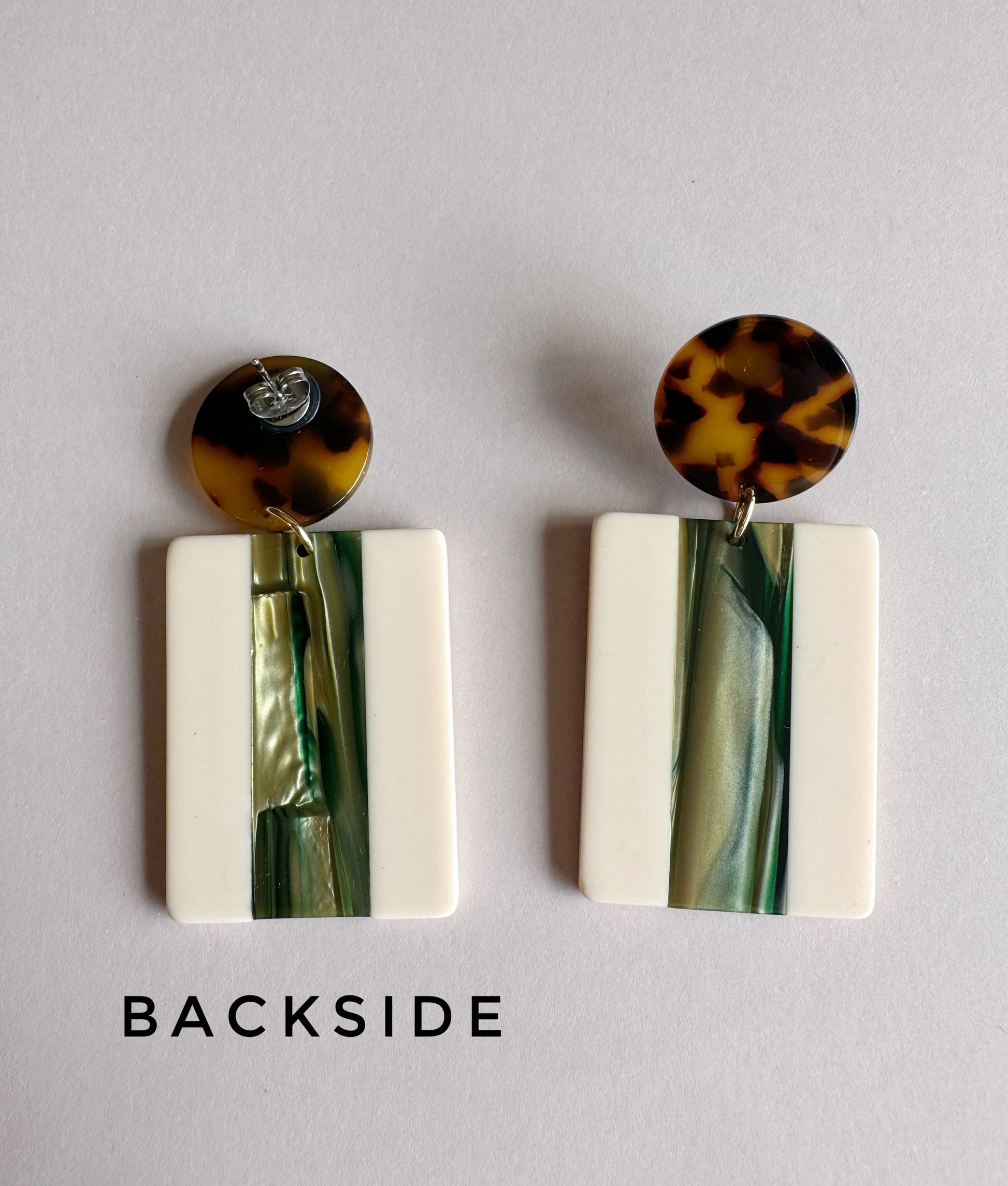 • Tortoise shell stud with beige & green acetate drop for a striking color combination.