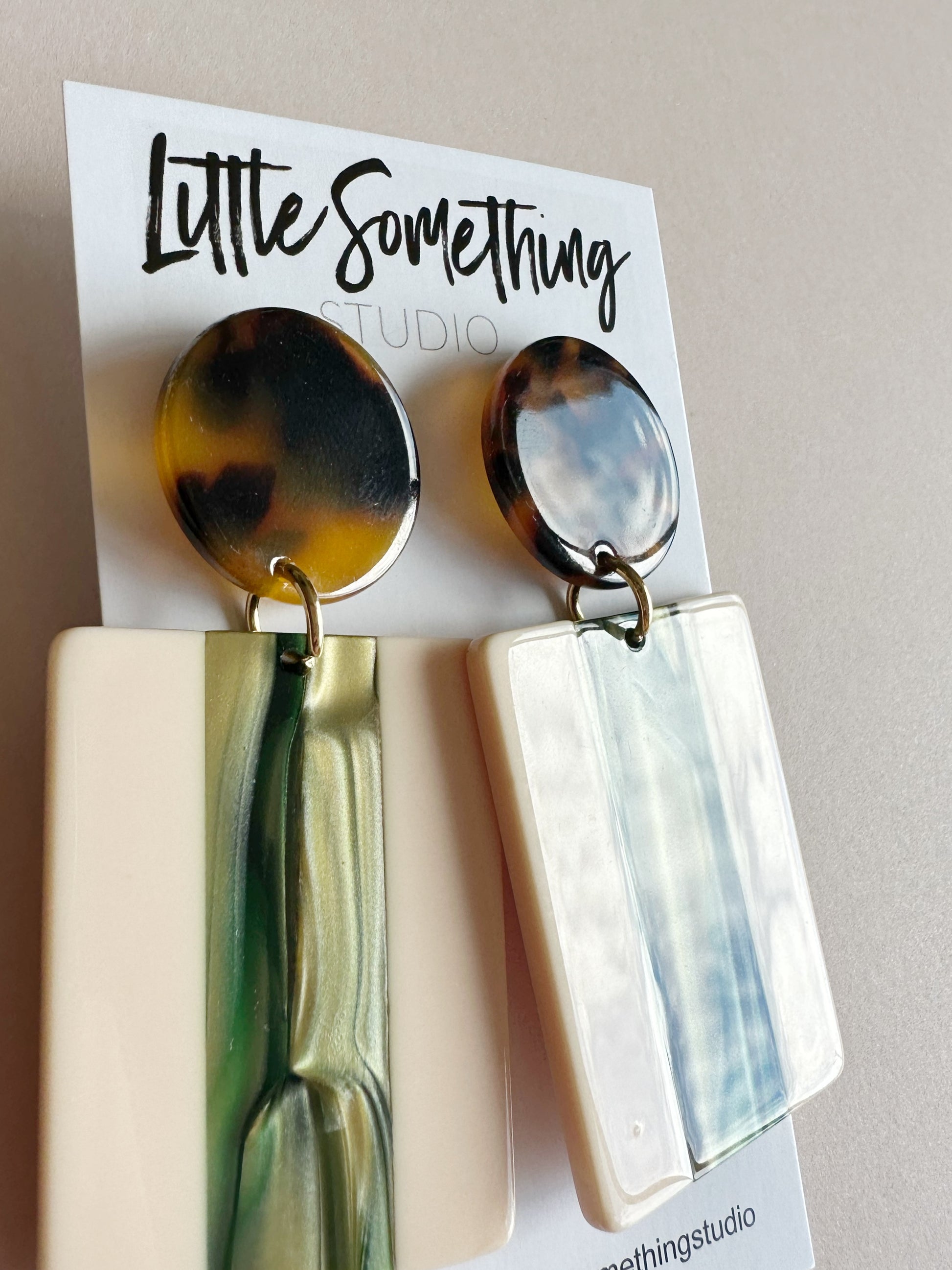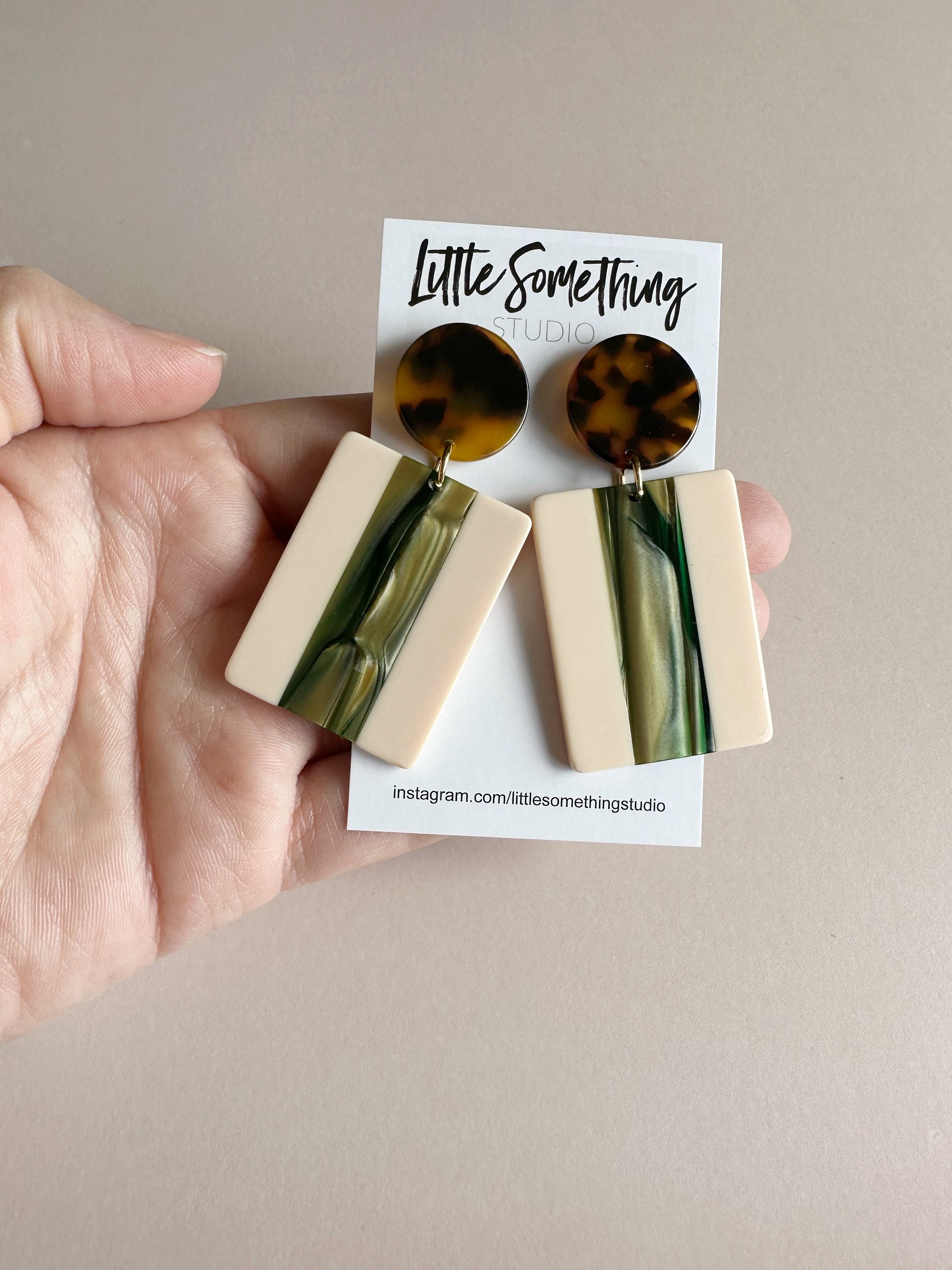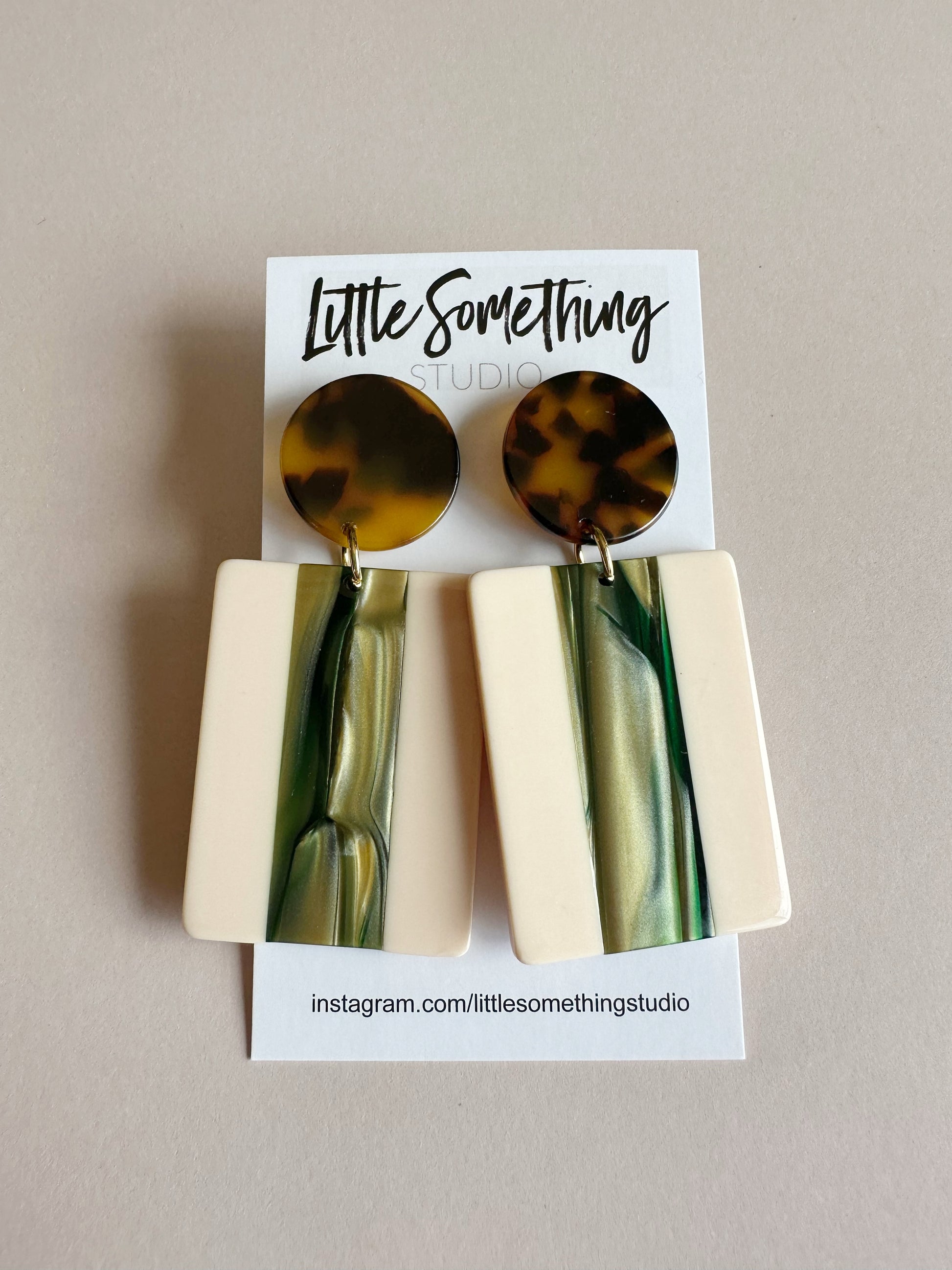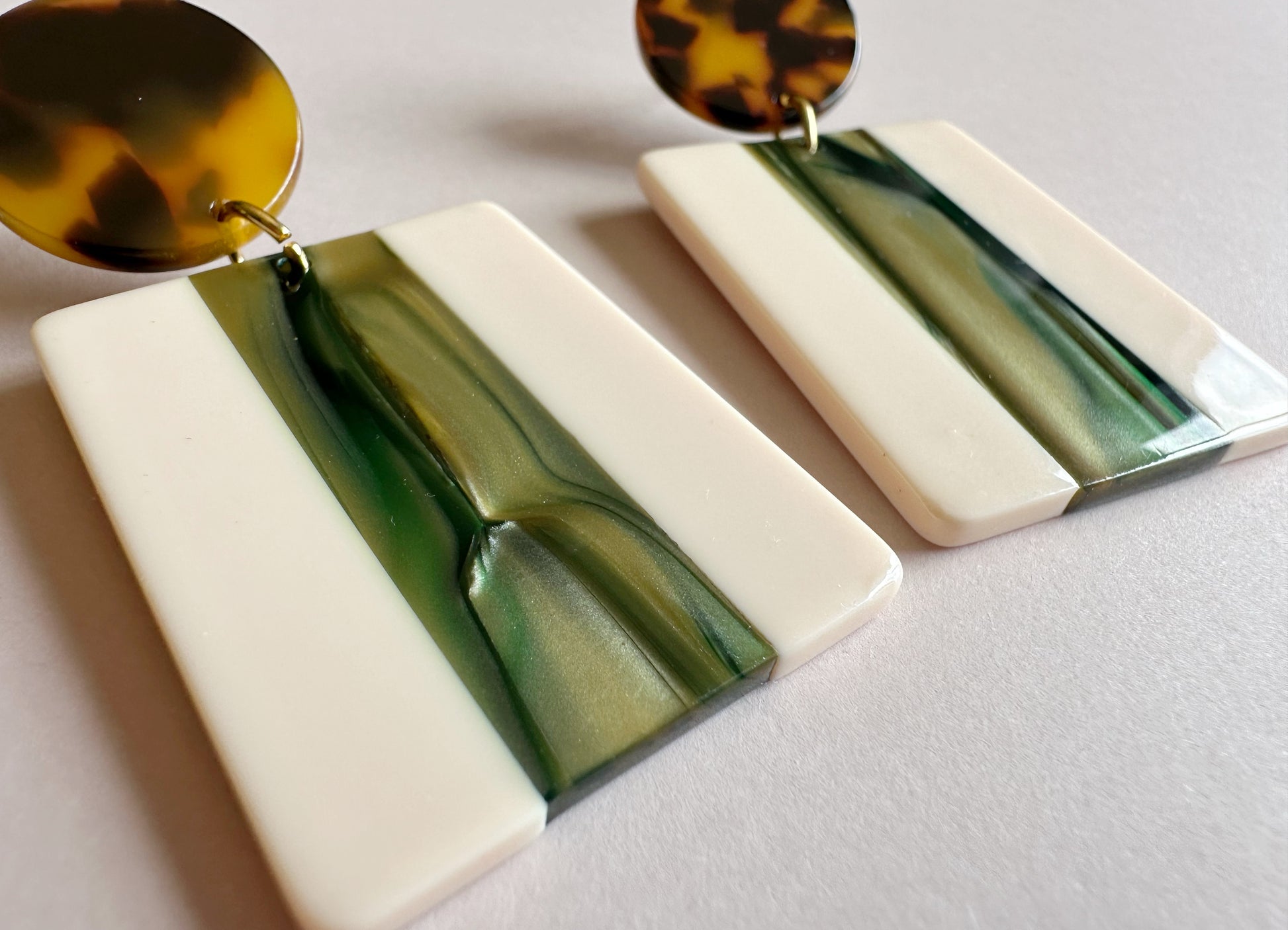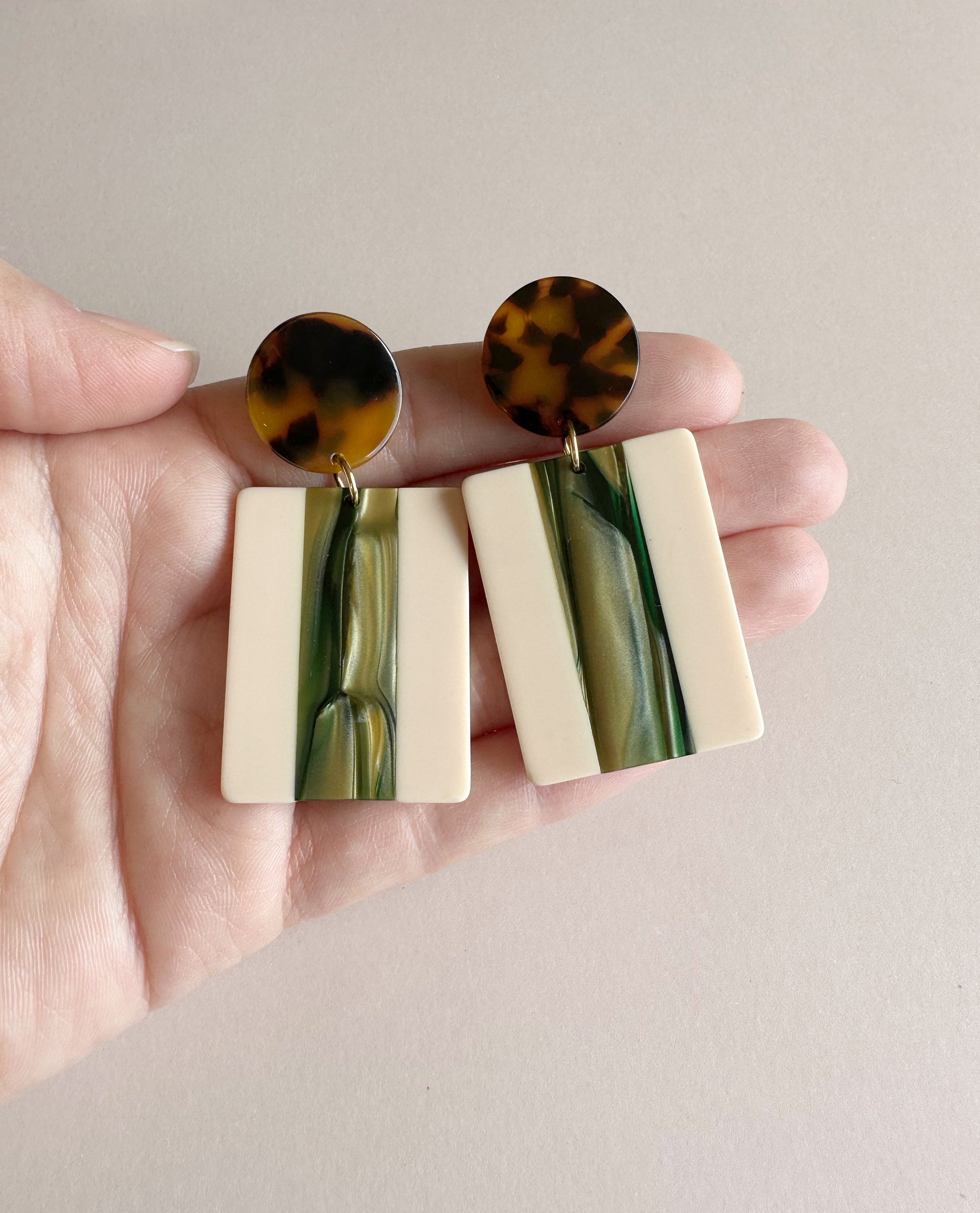 • Tortoise shell stud with beige & green acetate drop for a striking color combination.