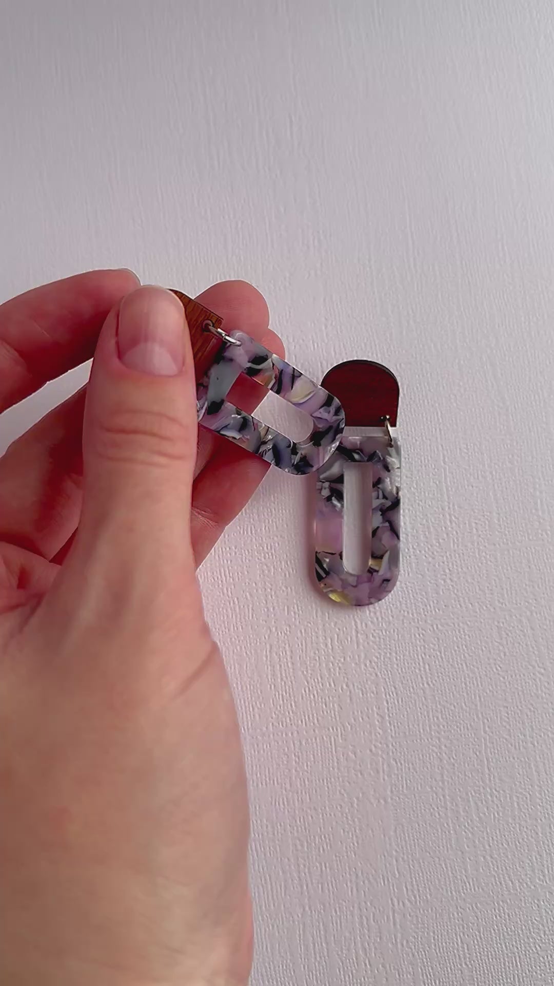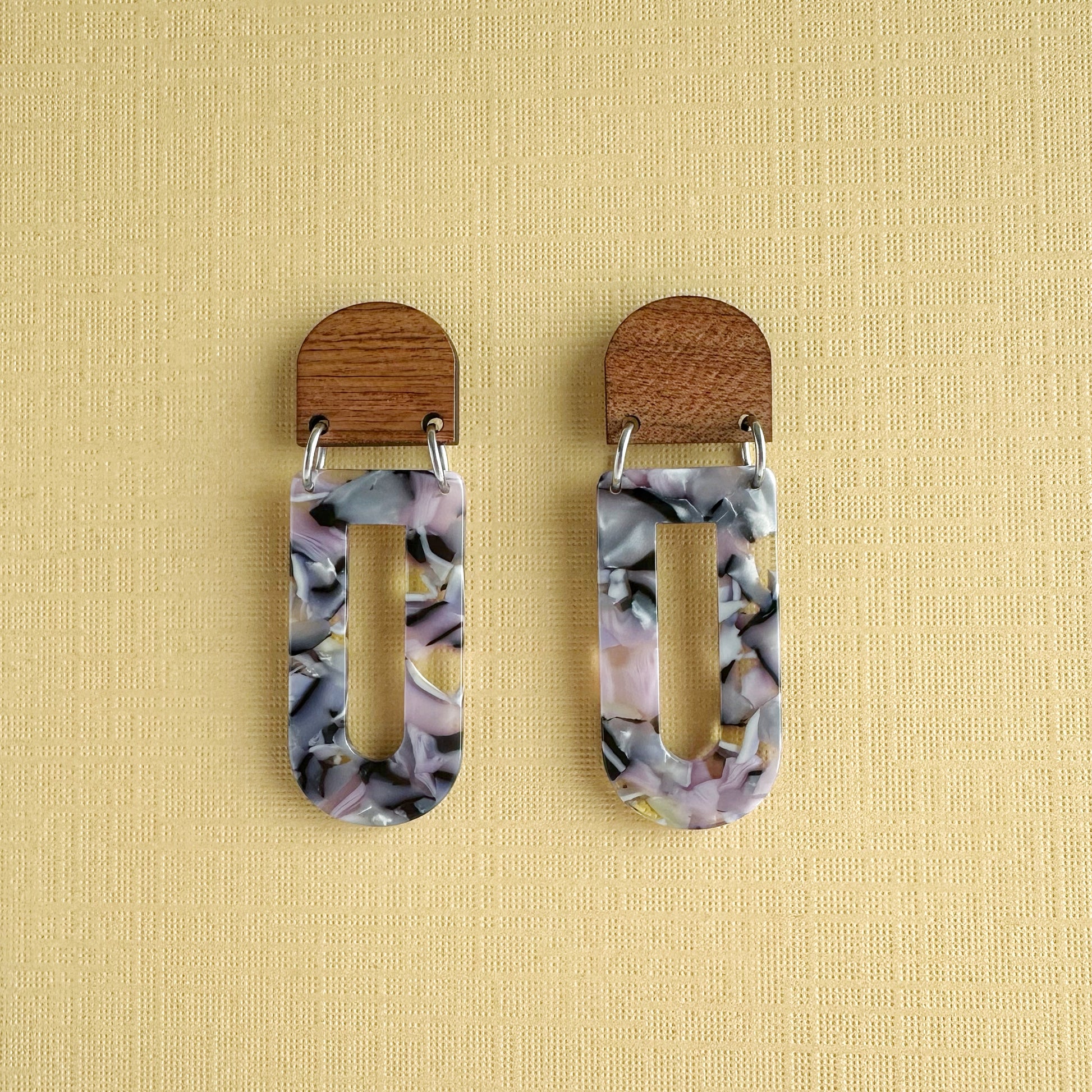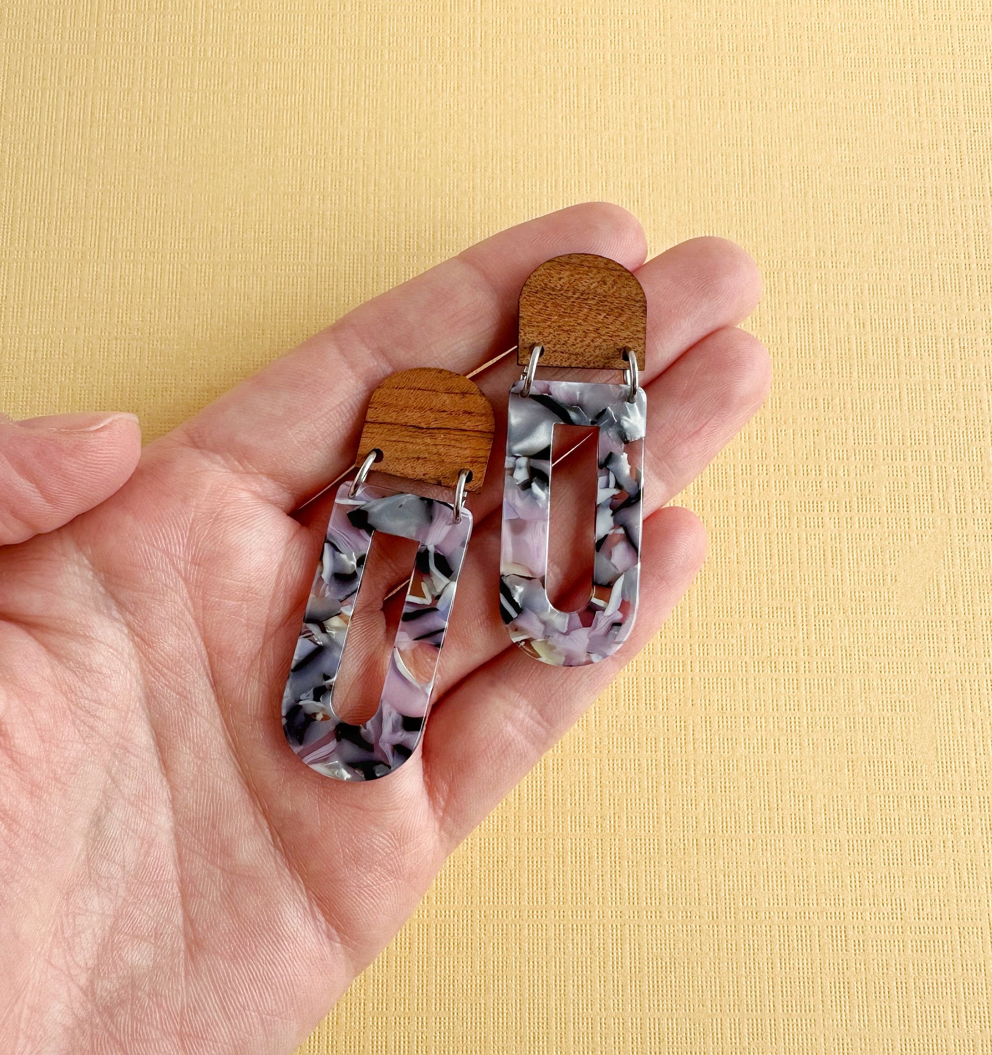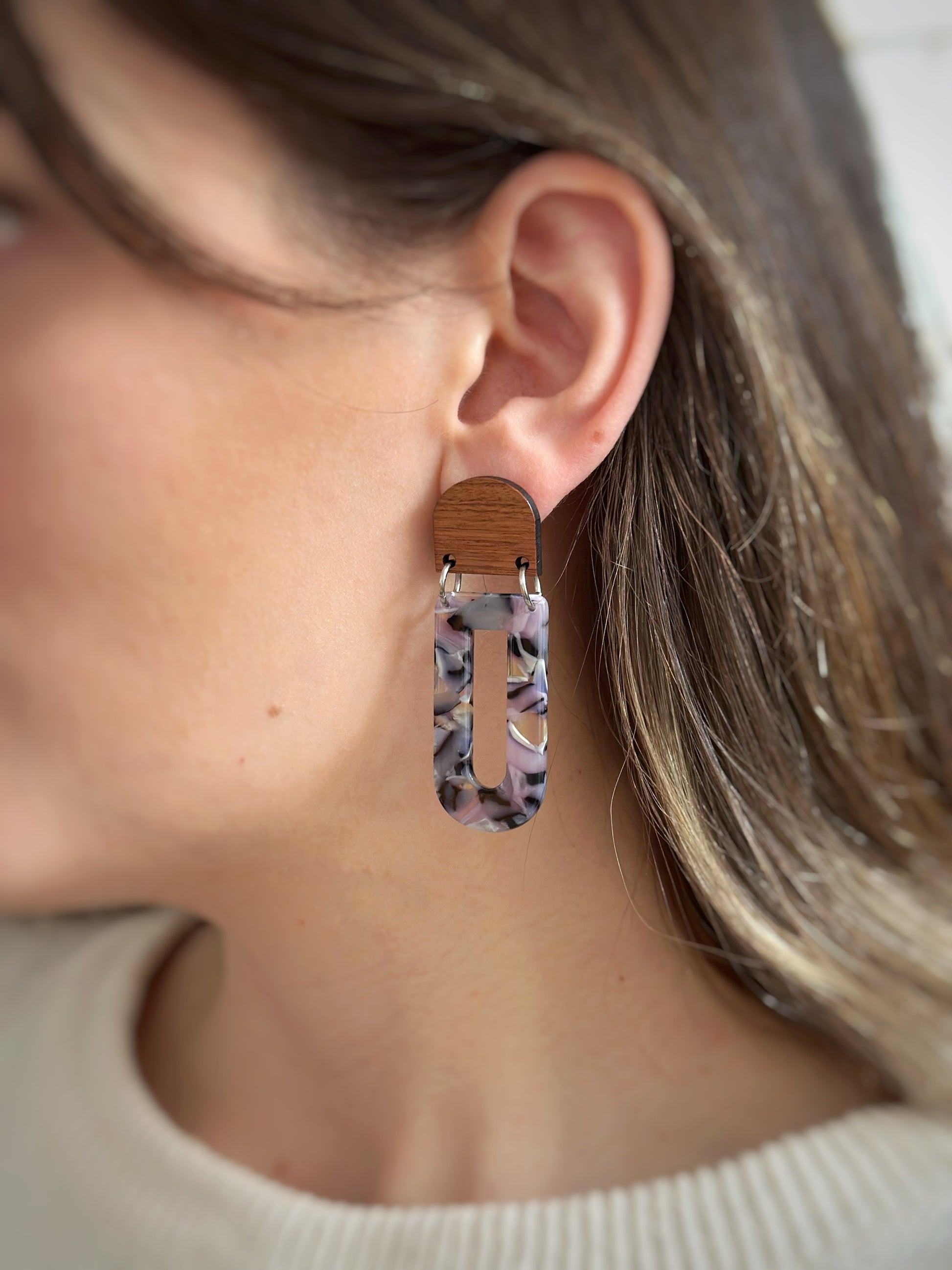 Add a touch of modern elegance with these geometric lightweight dangle earrings, featuring a stunning blend of natural wood and pastel marbled acetate. Their contemporary yet boho-inspired design makes them a versatile statement piece, perfect for casual wear or dressing up. With their lightweight feel, these earrings offer bold style without discomfort—making them an ideal unique gift for her.