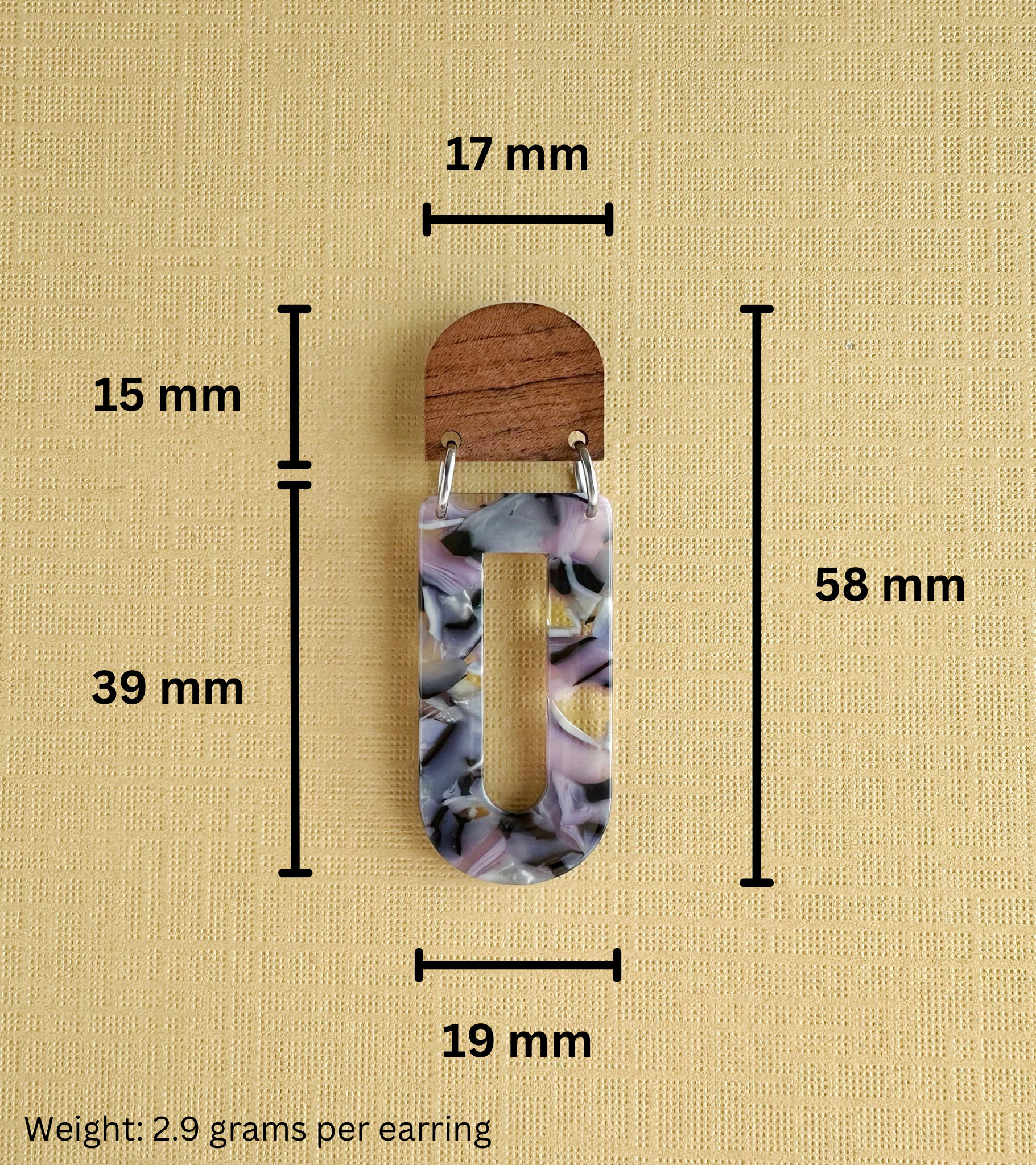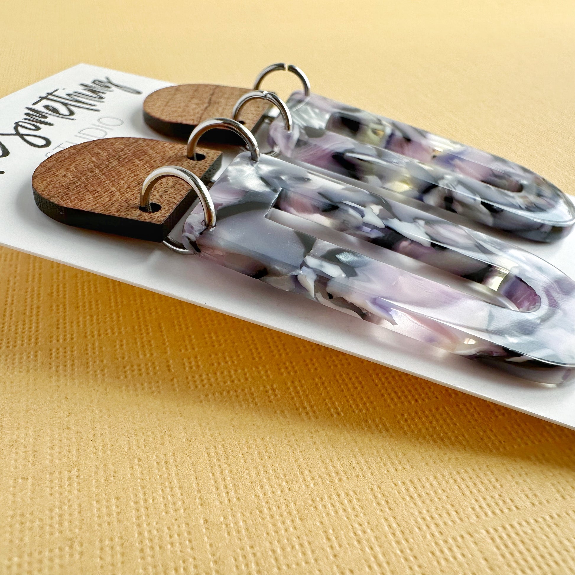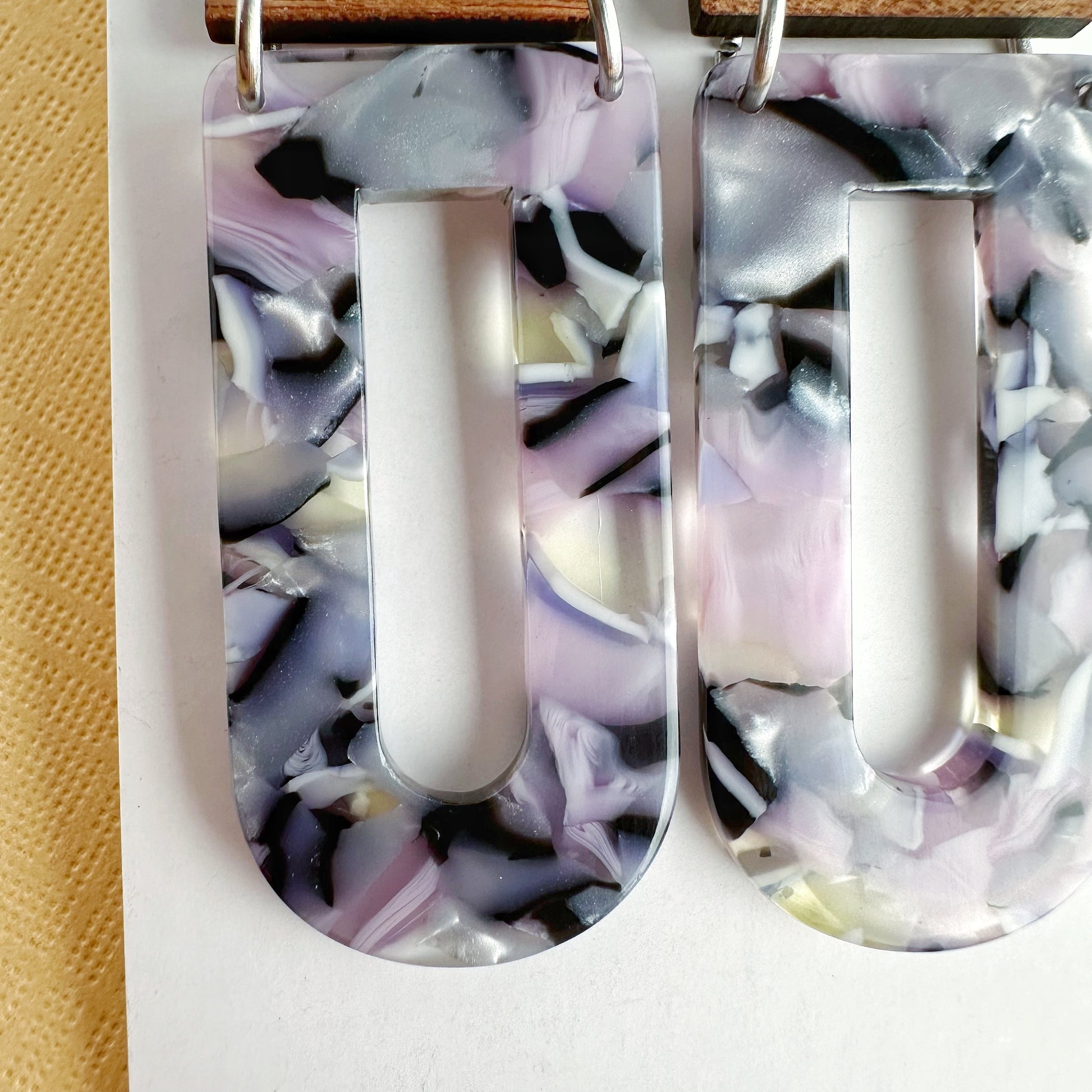 Add a touch of modern elegance with these geometric lightweight dangle earrings, featuring a stunning blend of natural wood and pastel marbled acetate. Their contemporary yet boho-inspired design makes them a versatile statement piece, perfect for casual wear or dressing up. With their lightweight feel, these earrings offer bold style without discomfort—making them an ideal unique gift for her.