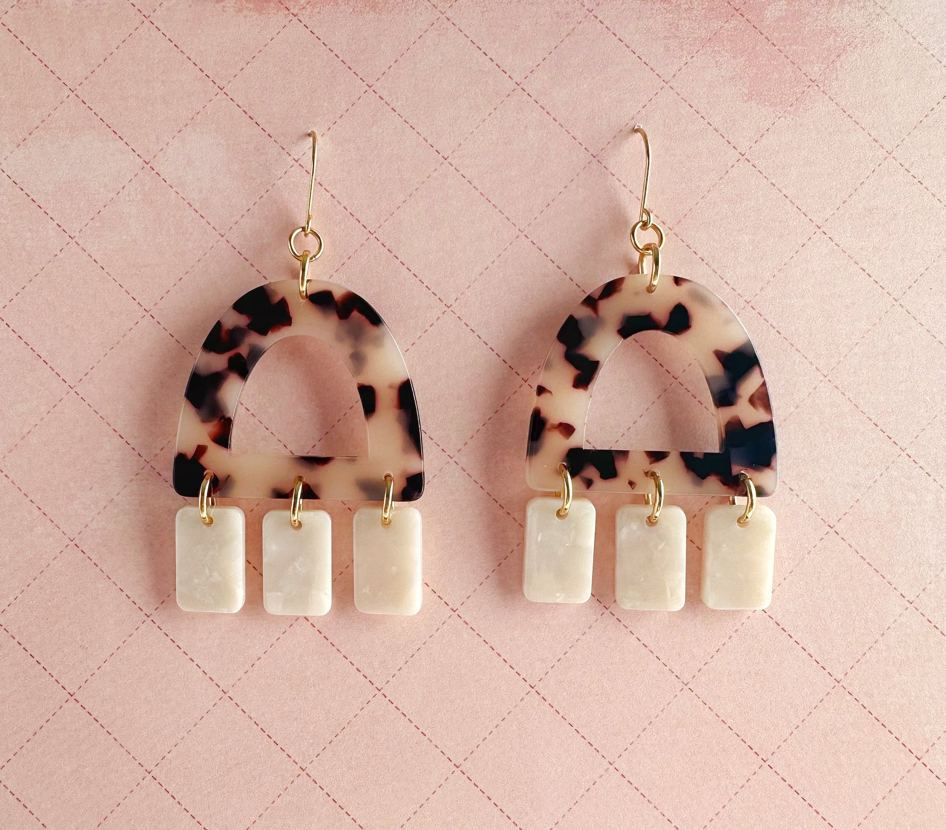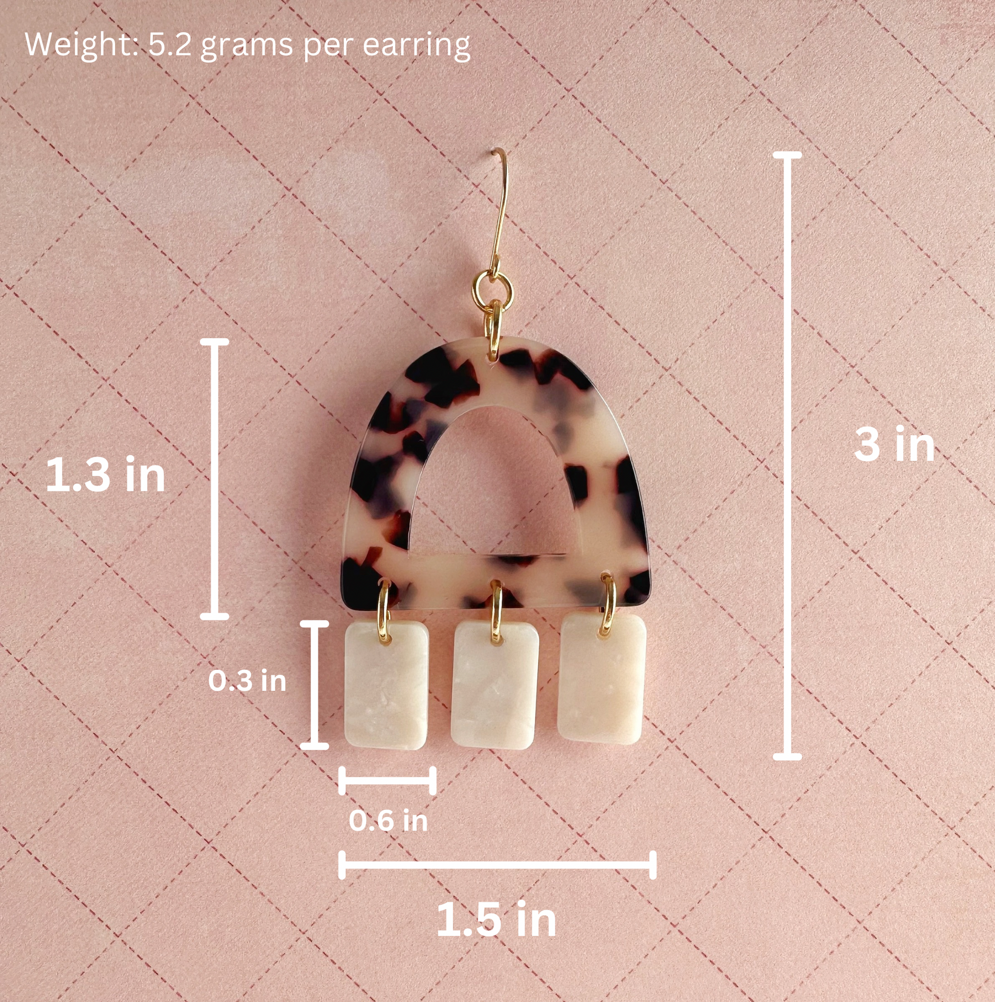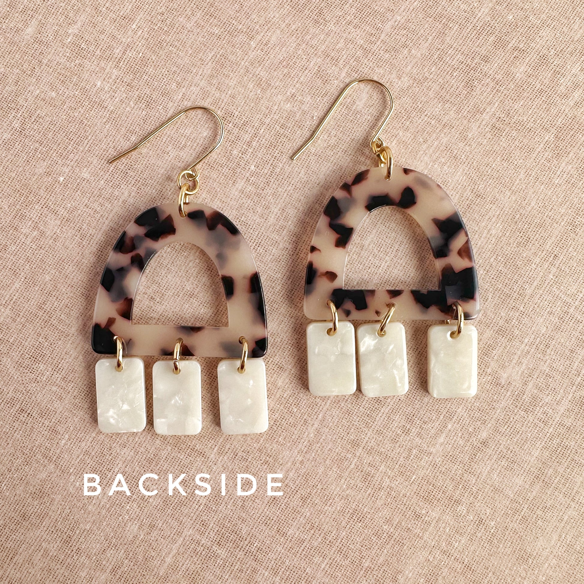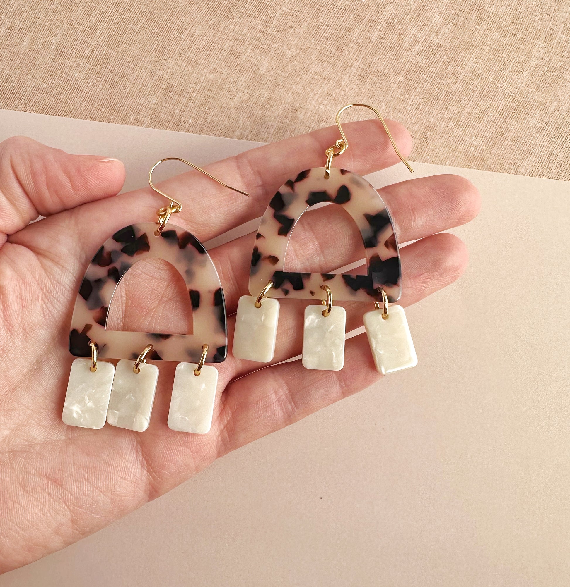 Make a bold statement with these tortoise shell arch earrings featuring a chic geometric design! Handcrafted from lightweight acetate, these dangle earrings are perfect for everyday wear or special occasions. The neutral tortoiseshell pattern paired with elegant pearlized rectangular charms creates a trendy yet timeless aesthetic.