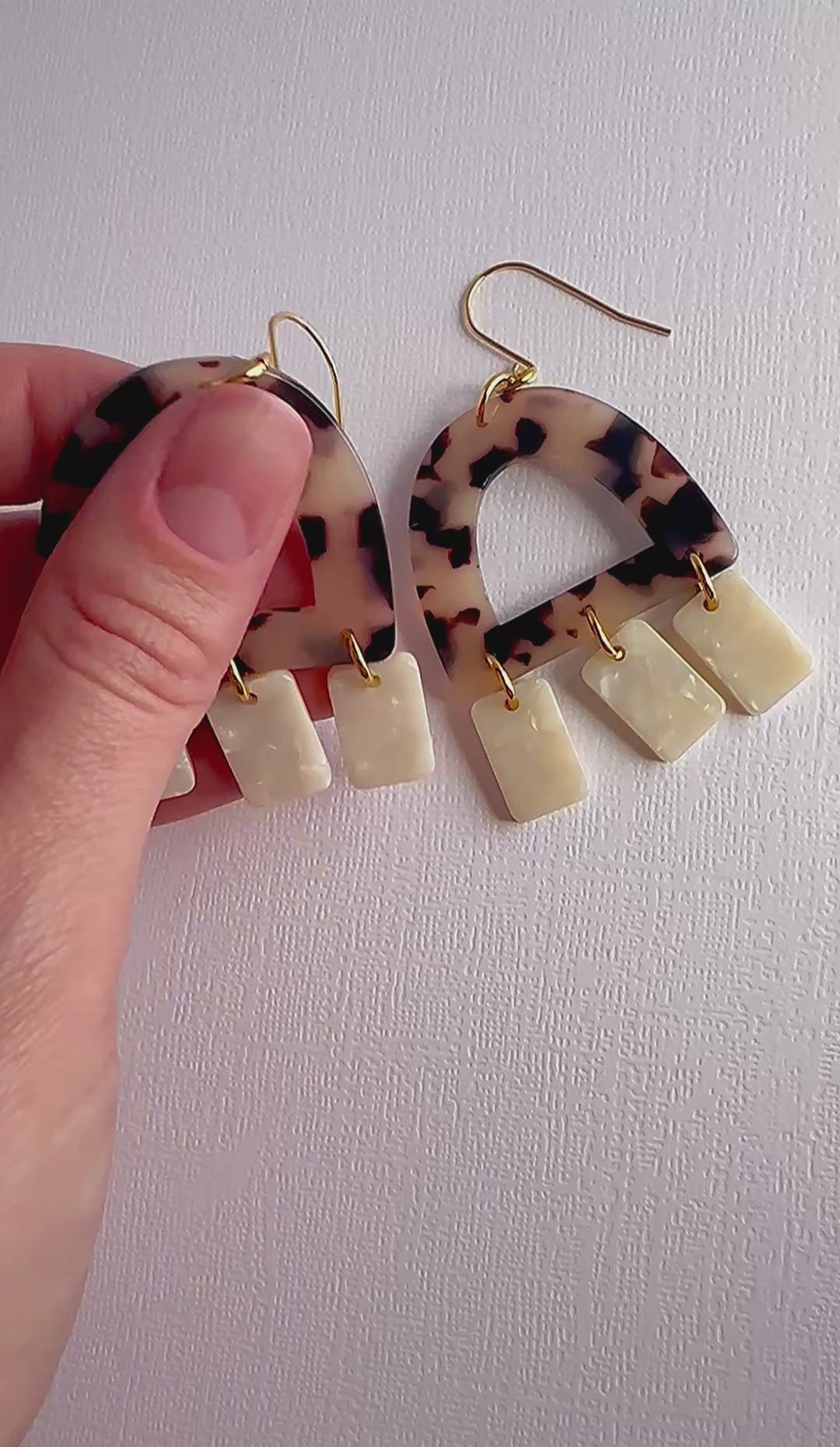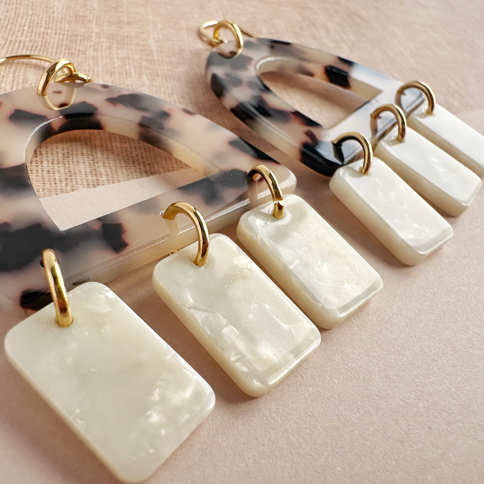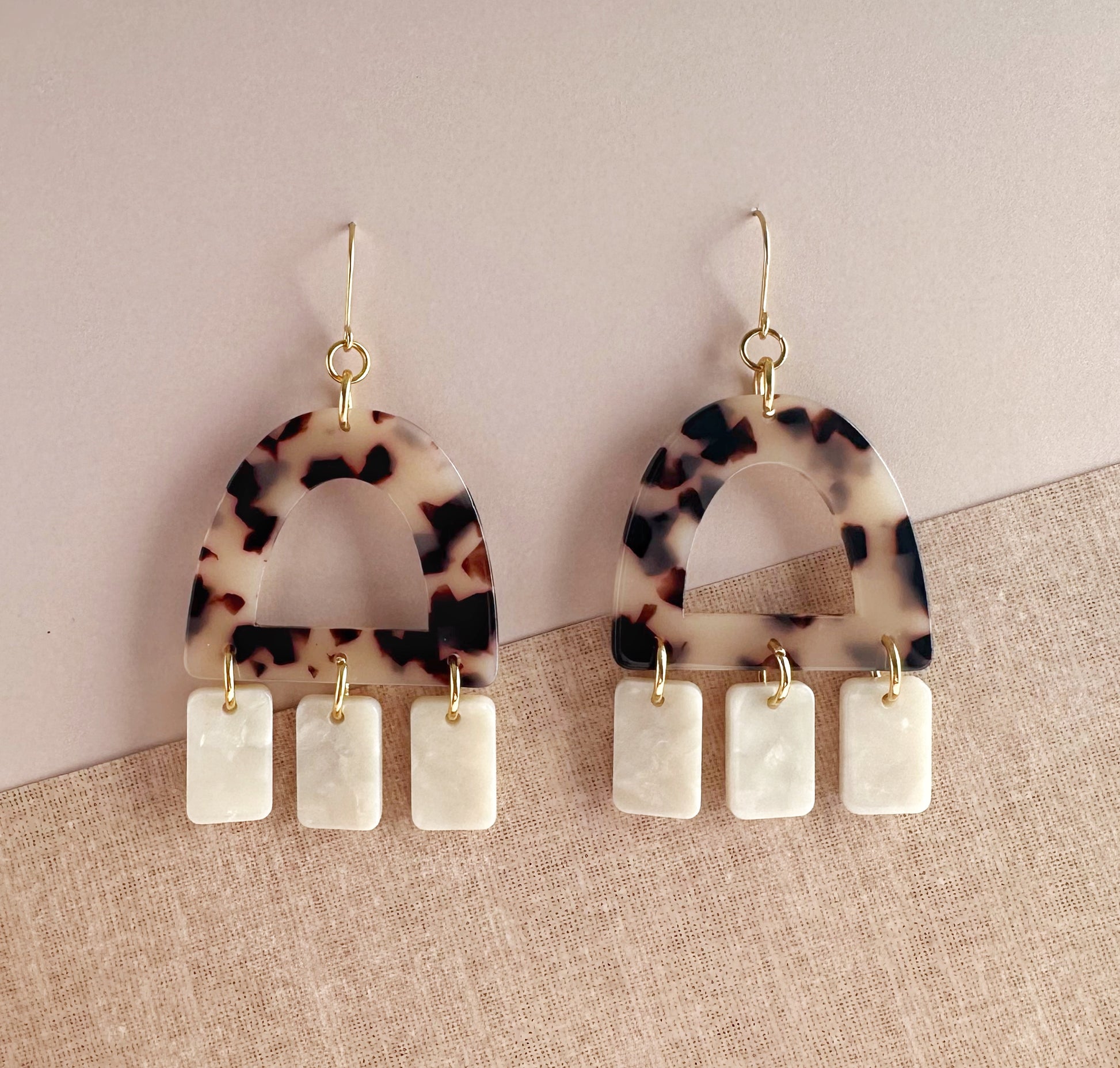Make a bold statement with these tortoise shell arch earrings featuring a chic geometric design! Handcrafted from lightweight acetate, these dangle earrings are perfect for everyday wear or special occasions. The neutral tortoiseshell pattern paired with elegant pearlized rectangular charms creates a trendy yet timeless aesthetic.