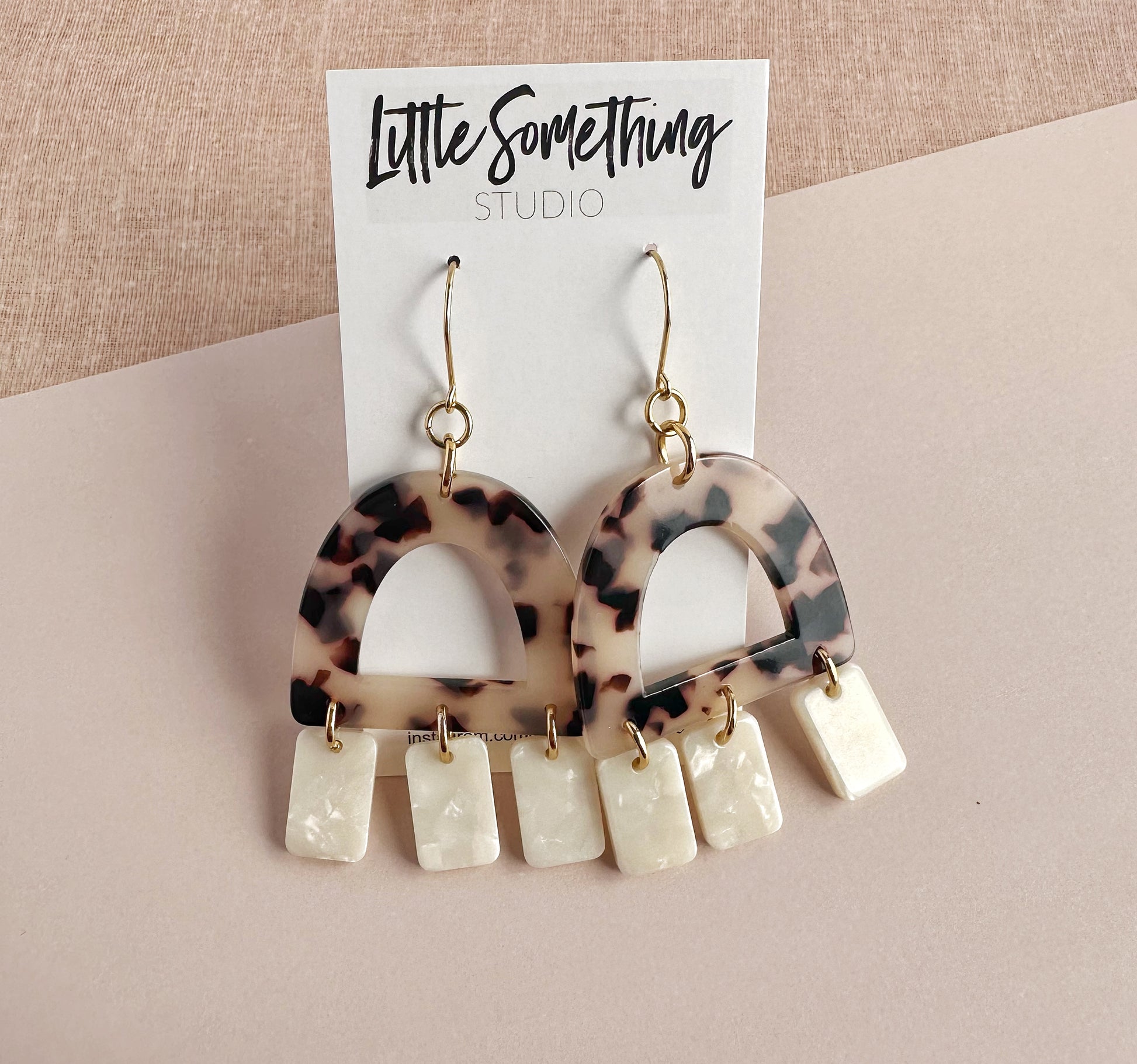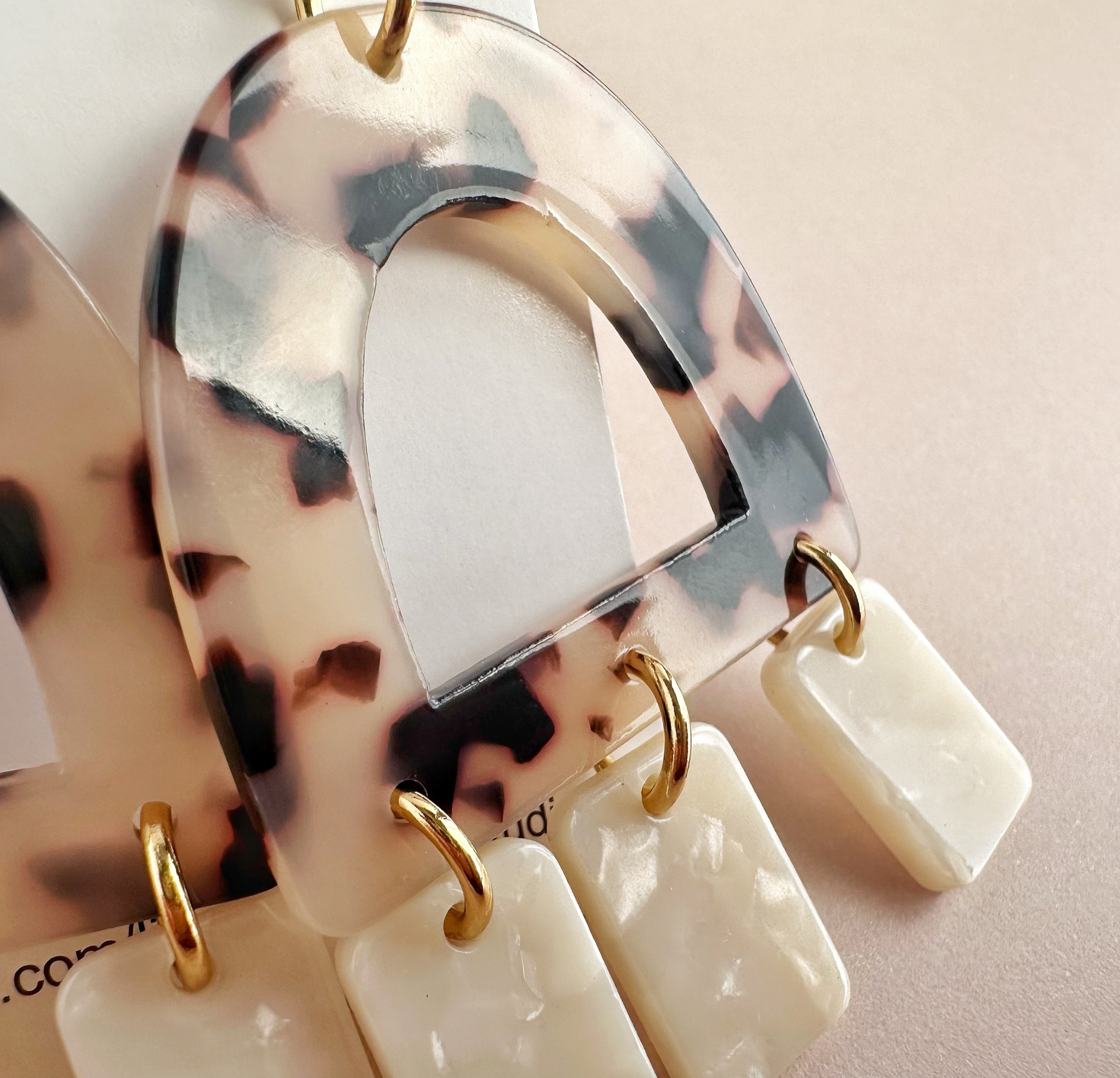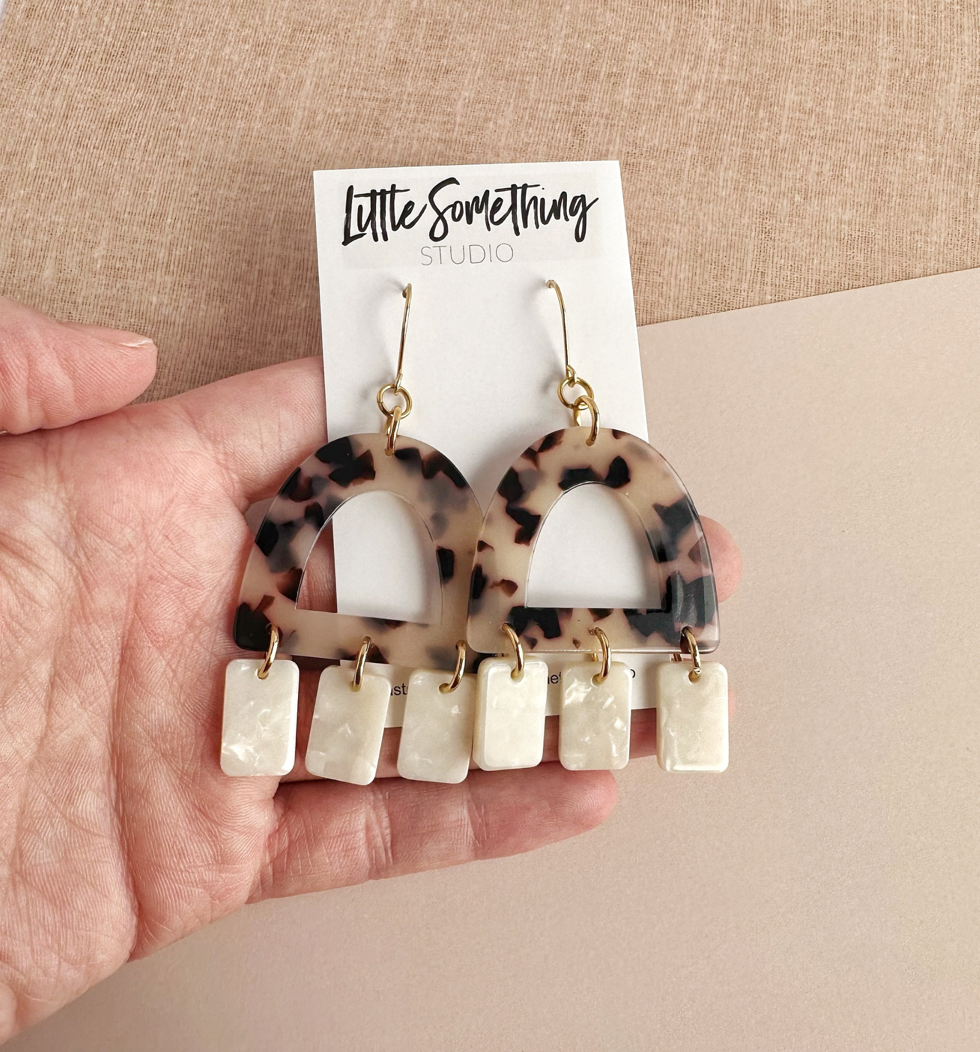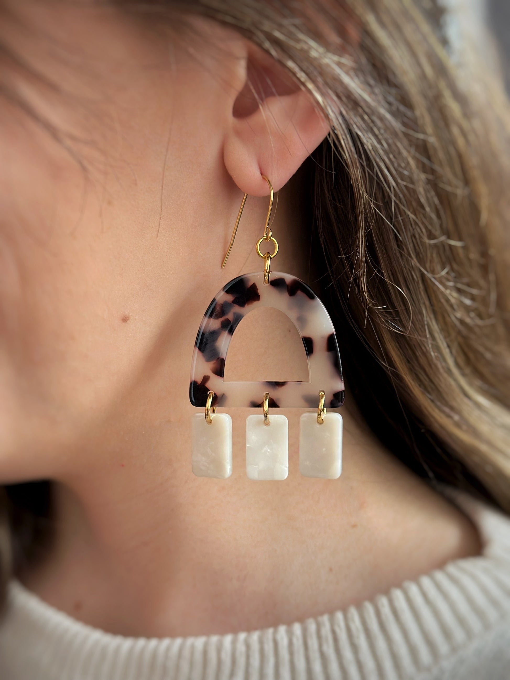 Make a bold statement with these tortoise shell arch earrings featuring a chic geometric design! Handcrafted from lightweight acetate, these dangle earrings are perfect for everyday wear or special occasions. The neutral tortoiseshell pattern paired with elegant pearlized rectangular charms creates a trendy yet timeless aesthetic.