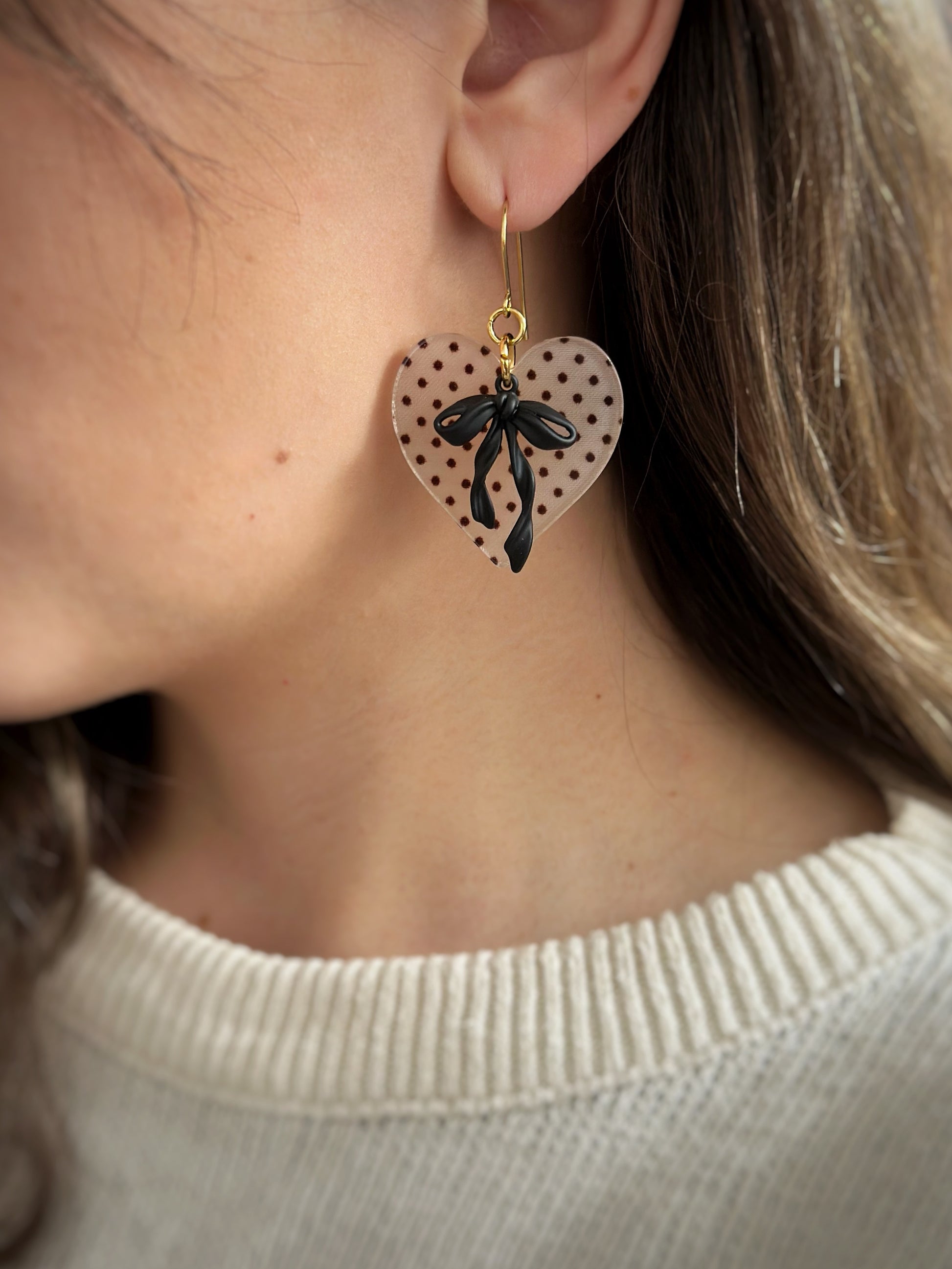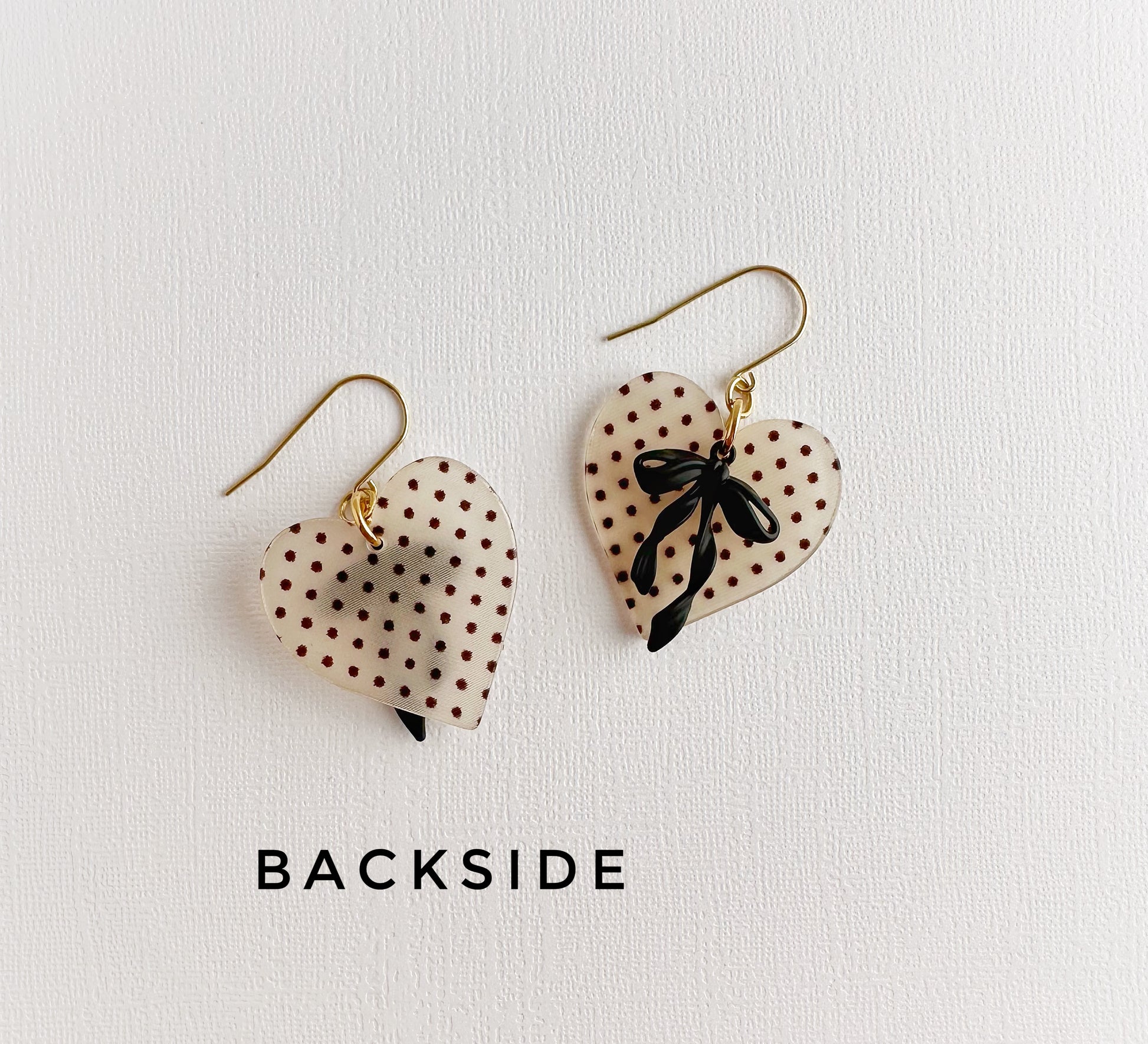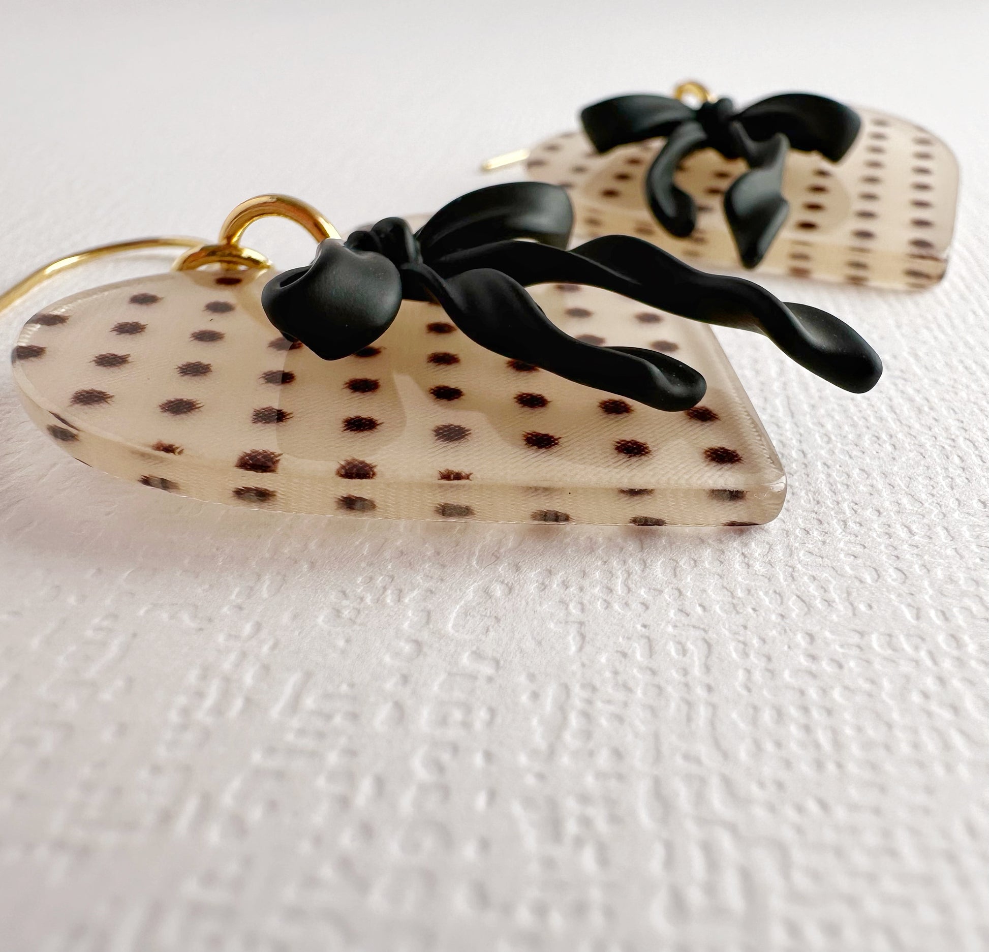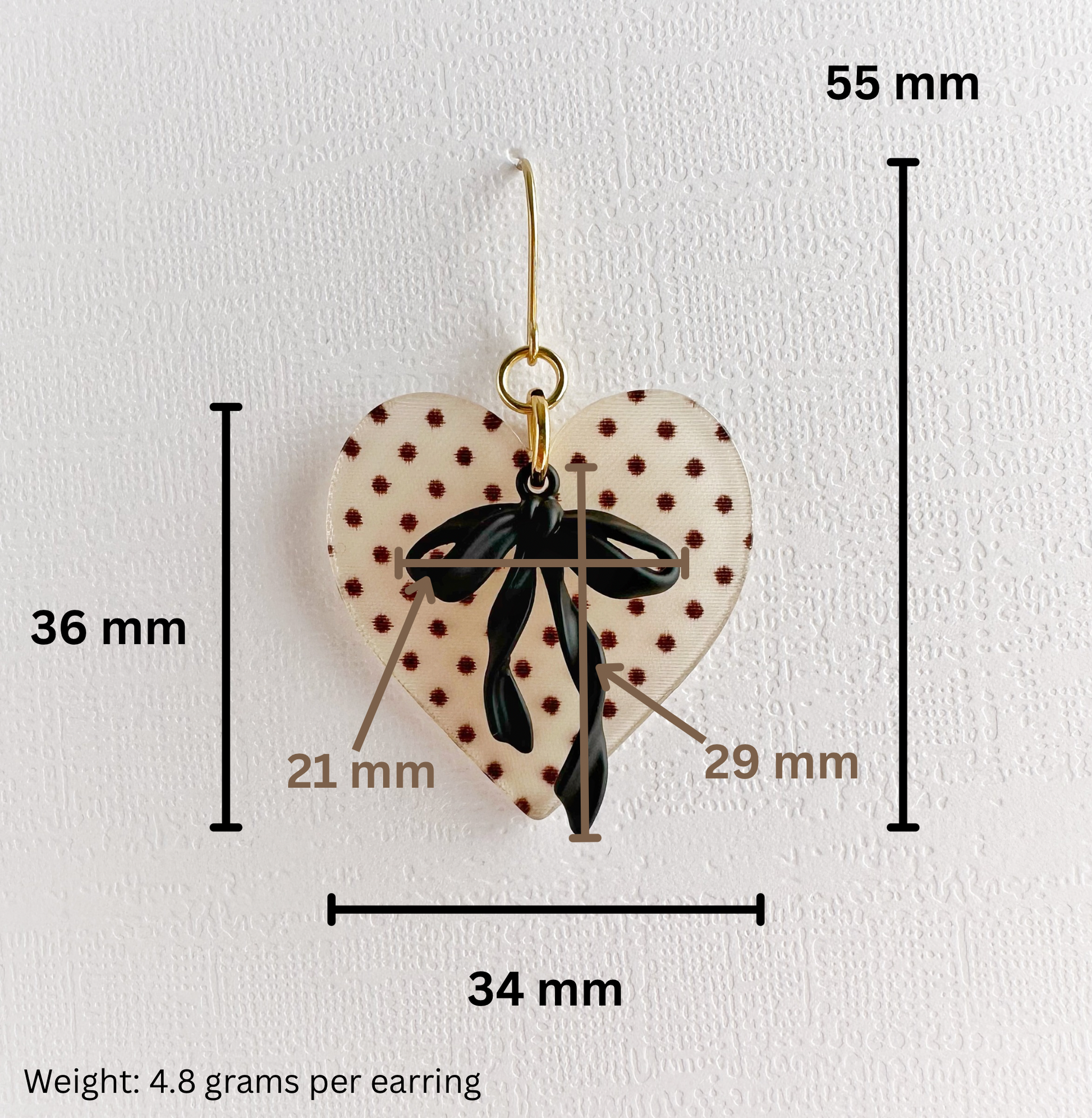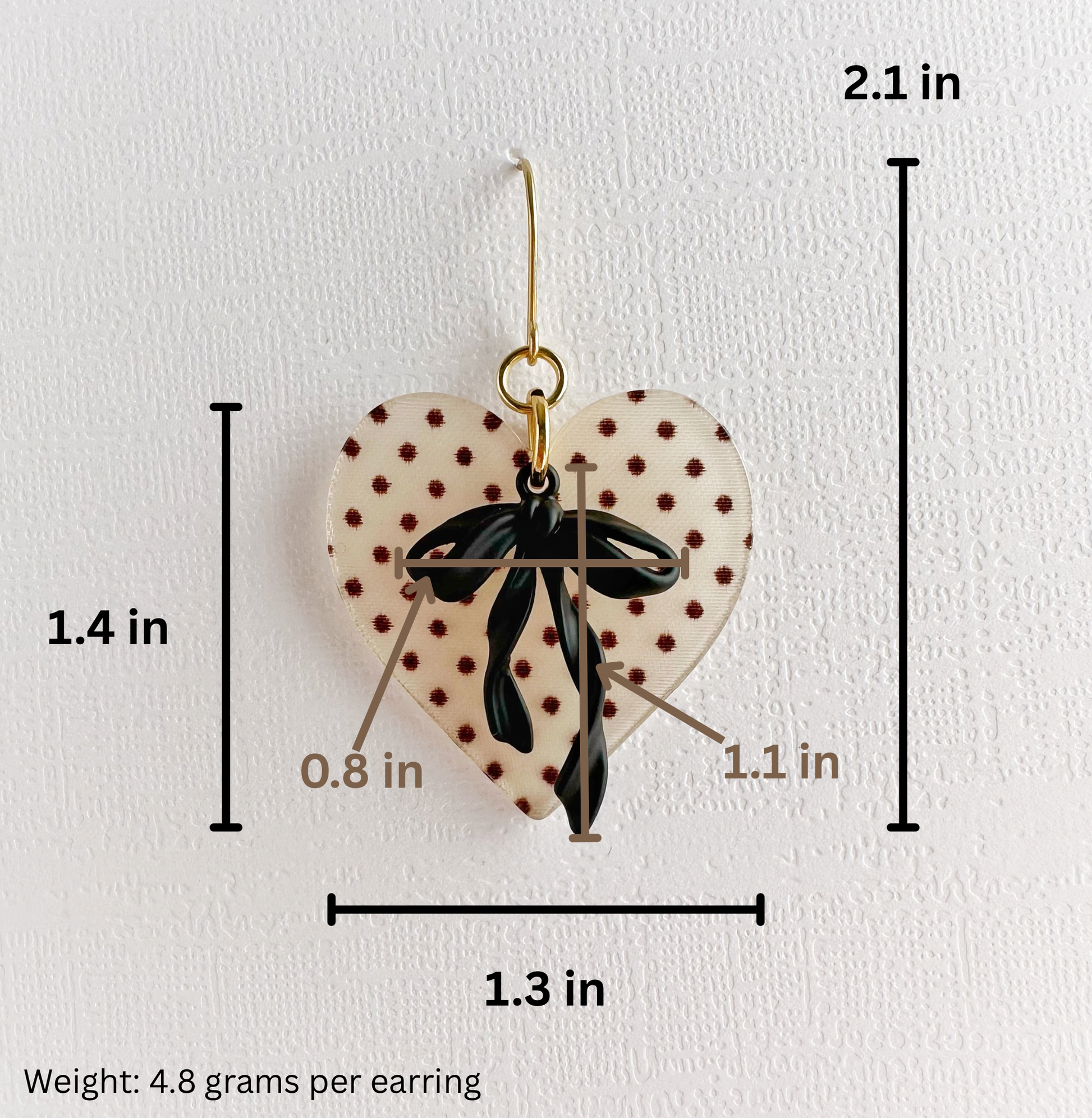 Add a playful pop to your look with these polka dot heart statement earrings. Featuring a lightweight resin heart with retro polka dots and a dangling black bow charm, these earrings blend girly Y2K style with a bold, unique twist. The eye-catching design makes them the perfect accessory for everyday fun or a standout finishing touch on a night out.